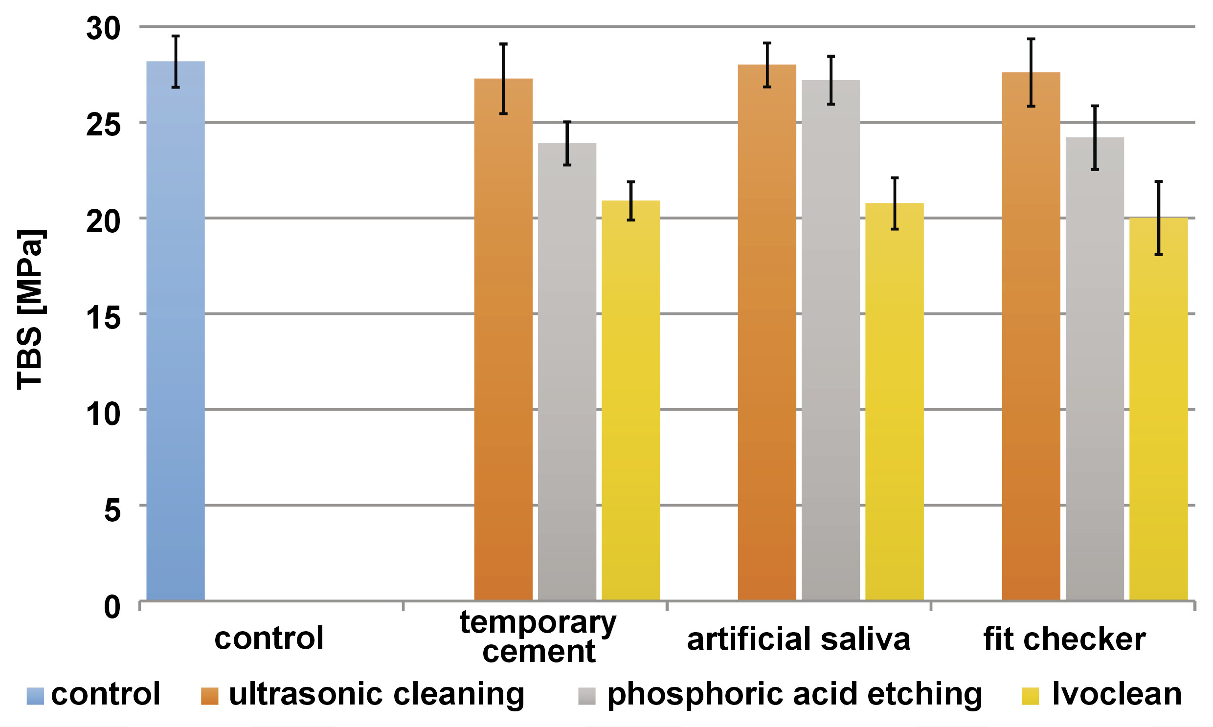 Results. There was a significant interaction between both tested variables (the contamination and cleaning methods) (p < 0.001). The samples contaminated with artificial saliva showed a significantly higher TBS value than the samples subjected to other contaminants (p = 0.005). For the samples contaminated with temporary cement and a fit checker, there were significant differences between the different cleaning methods, with ultrasonic cleaning providing the highest TBS values, followed by phosphoric acid etching, and finally Ivoclean (p < 0.001).