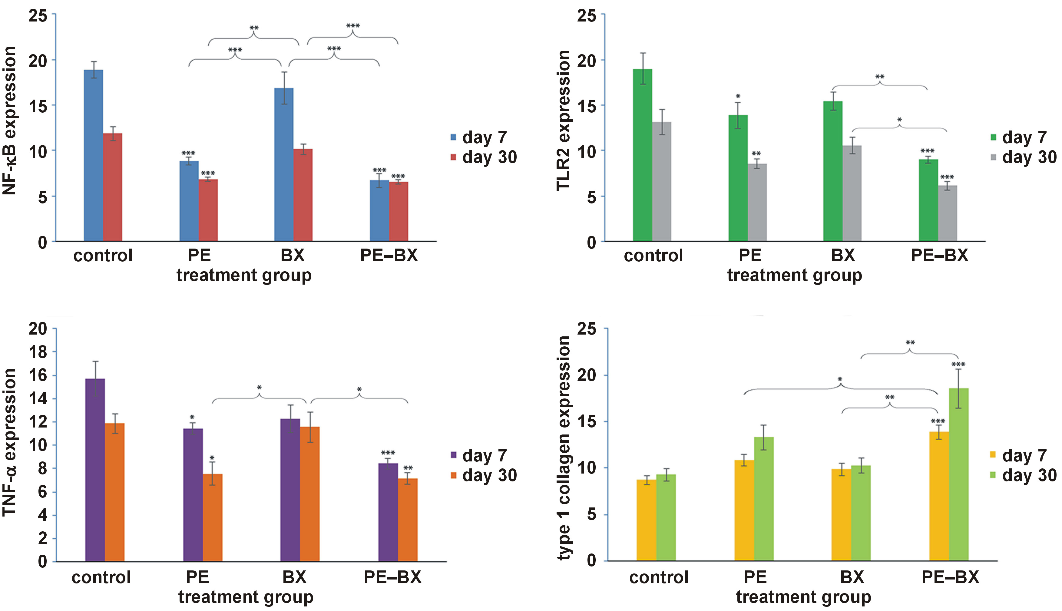 Results. The PE–BX group demonstrated promising results, with increased type I collagen levels and reduced expression of inflammatory markers (NF-κB, TLR2 and TNF-α) on days 7 and 30 (p < 0.001). Furthermore, in comparison with the BX group, this material demonstrated significantly higher type I collagen expression on days 7 and 30 (p < 0.01).