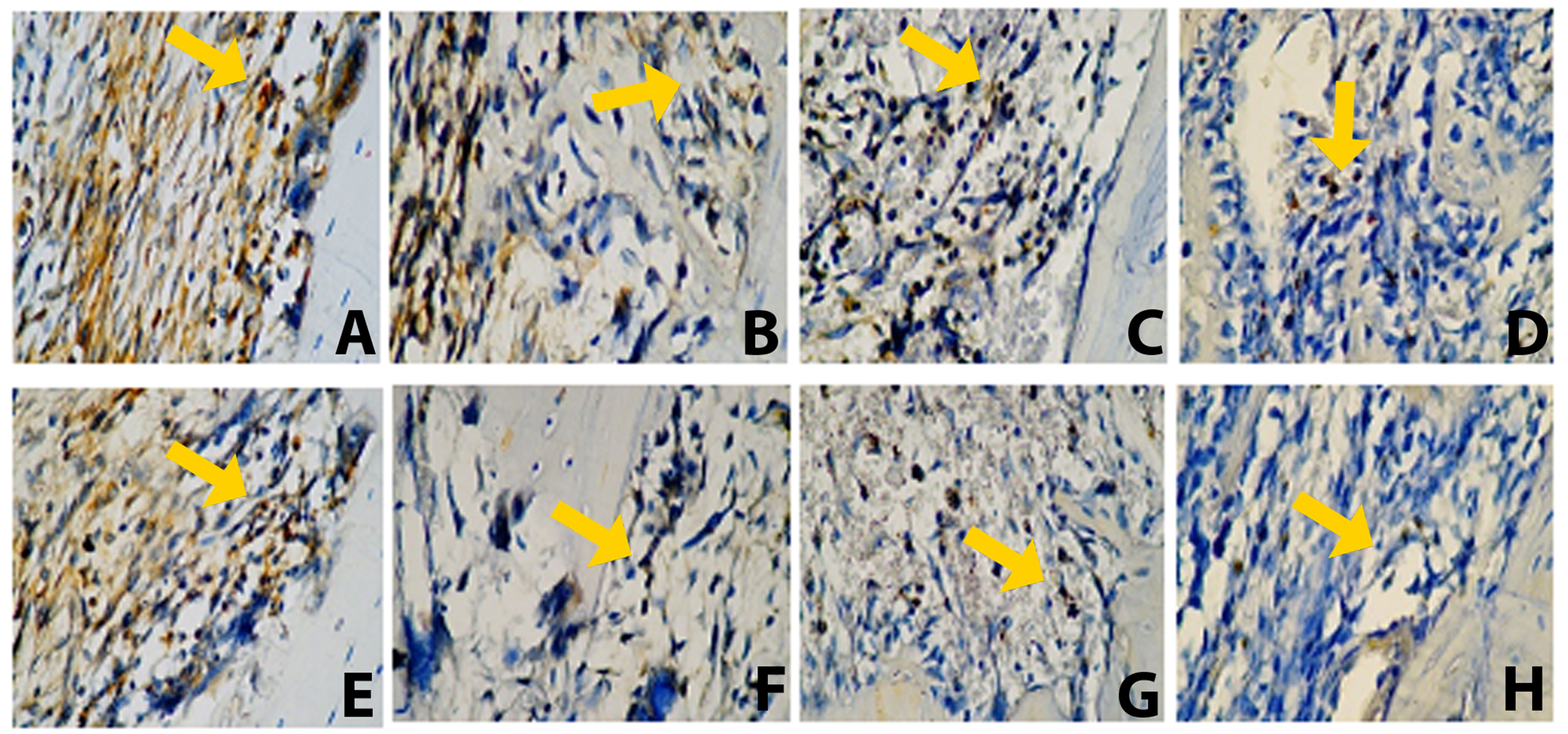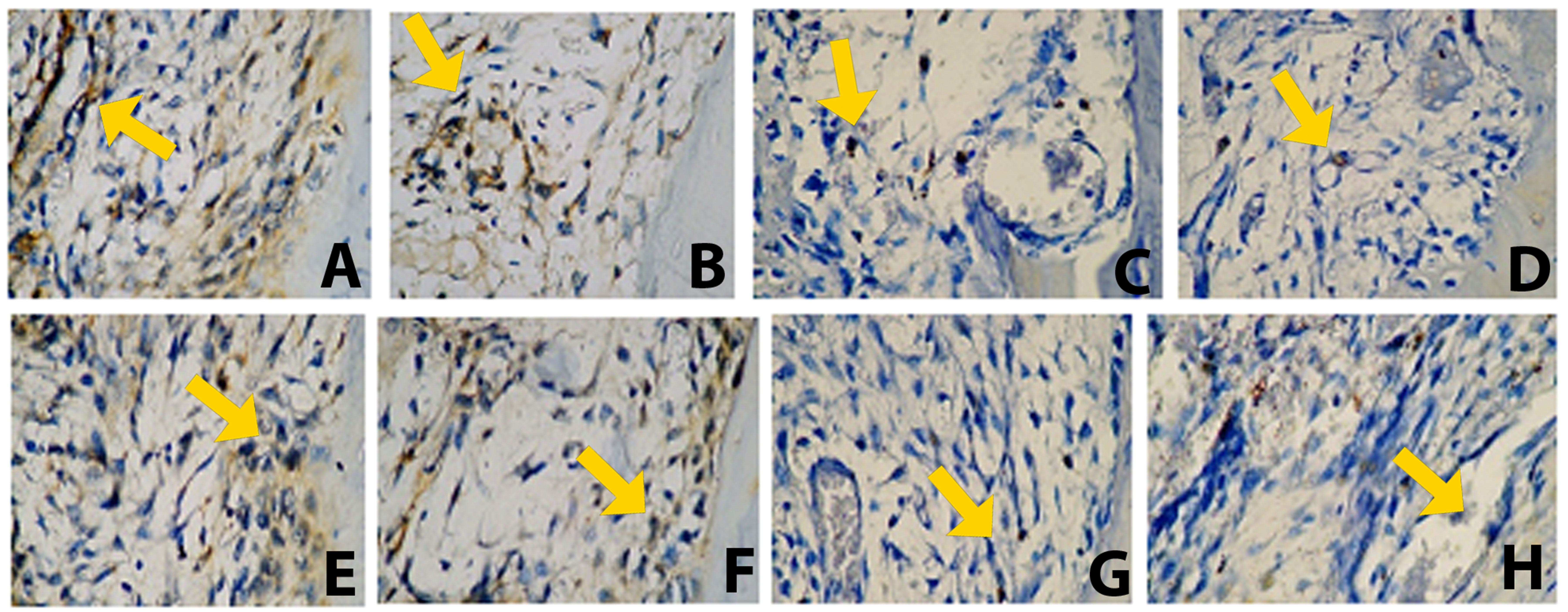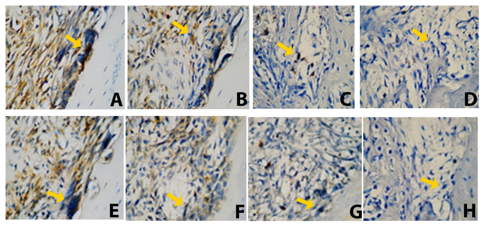 On day 7, the PE and PE–BX groups differed significantly from the control group, with p-values of <0.05 and <0.001, respectively. A slight reduction in TNF-α expression was observed in the PE group on day 30. The PE–BX group also showed a significant difference as compared to the control group on day 30 (p < 0.01). Furthermore, the propolis-containing groups demonstrated significant differences in comparison with the BX group on day 30 (Figure 1). Representative histological images of the apical third of the extraction socket are shown in Figure 4. The yellow arrow indicates osteoclasts along the bone margin exhibiting positive TNF-α expression.
