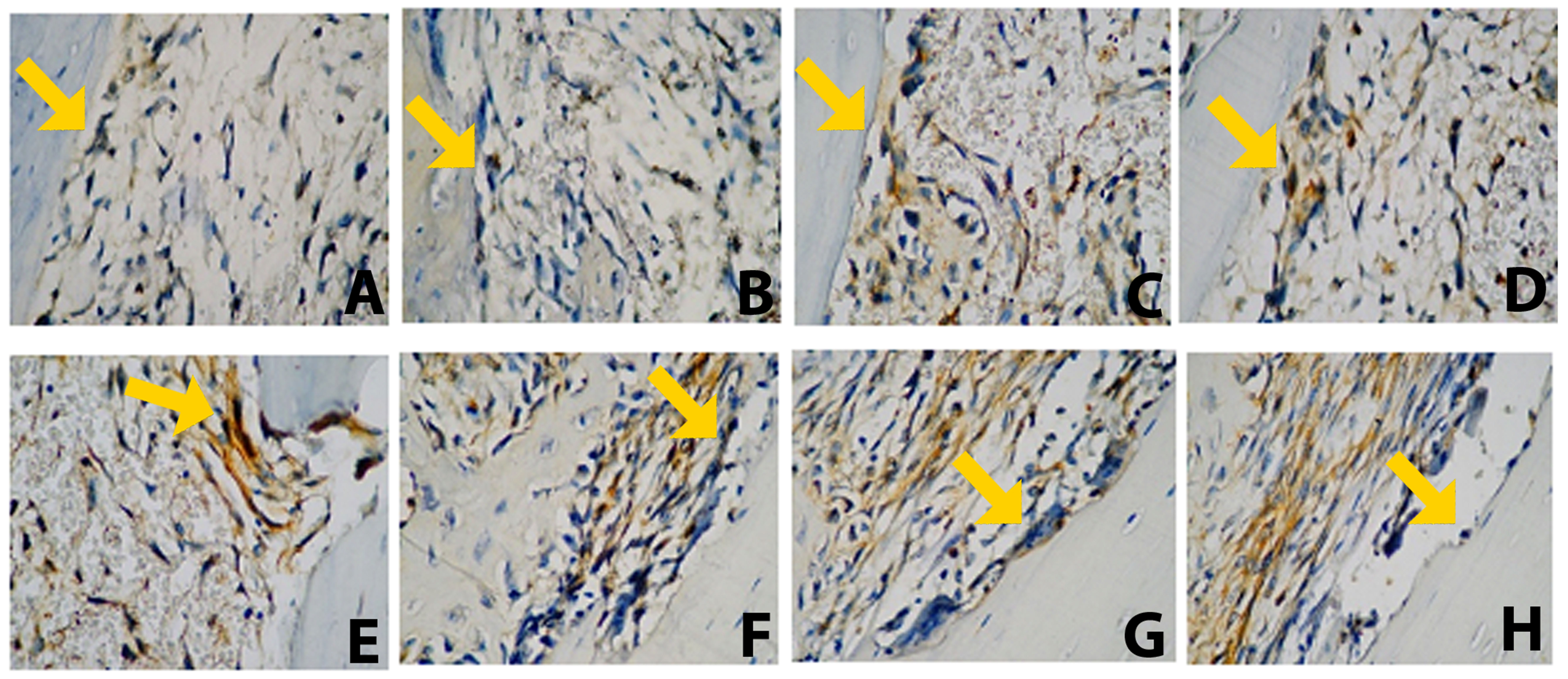An increasing trend in type I collagen expression was observed in all groups from day 7 to day 30. However, only the PE–BX group showed a significant difference in comparison with the control group (p < 0.001). A significant difference was also identified between the PE and PE–BX groups at the early observation time point (day 7) (p < 0.05). Furthermore, the PE–BX group differed significantly from the BX group at both time points (p < 0.01) (Figure 1). Representative histological images of the apical third of the extraction socket are presented in Figure 5. The yellow arrow indicates osteoblasts along the bone margin exhibiting positive type I collagen expression.