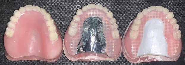 Three types of maxillary single dentures were constructed on maxillary master casts obtained from patients requiring maxillary single dentures. The maxillary arch presented a U-shaped residual alveolar ridge without bony or soft tissue undercuts. Group A included conventional acrylic resin maxillary single dentures without reinforcement (control group), group B encompassed maxillary single dentures reinforced with a digitally designed and milled Co–Cr framework, and group C comprised maxillary single dentures reinforced with a digitally designed and milled zirconia framework (Figure 1).
