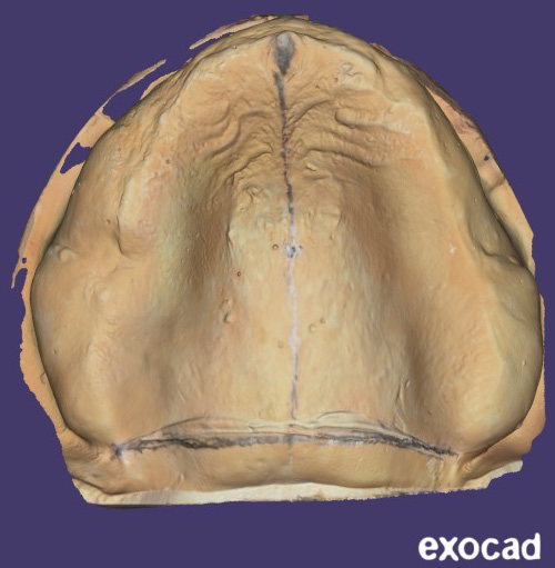 A desktop scanner (D850; 3Shape) with a camera resolution of 5 MP and an accuracy of 4 μm was used. This open system allows data export to the PartialCAD software.25 The definitive master cast scans were exported to OBJ files and imported into the PartialCAD module to preserve the drawn data on the cast. A plate design was used to reinforce the maxillary denture rather than a mesh or wire embedded within the acrylic denture base. It was found that the use of metal wire reinforcement inhibits polymerization and thermal shrinkage of the dough resin during denture construction, thereby compromising denture adaptation.28