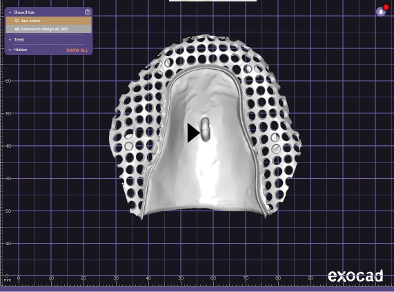 The object replacement character (OBJ) files of the scanned definitive master casts were imported into the digital design software partial module (PartialCAD; exocad GmbH, Darmstadt, Germany) to design the reinforcement frameworks for groups B and C (Figure 2). The frameworks were virtually relieved with a 0.5-mm thickness wax on the crest of the ridge with tissue stops and on the median palatine raphe. It was designed to cover the palatal area with an extended palatal plate, a major connector and a mesh denture base extending to the crest of the ridge. The framework thickness was set at 1.5 mm.20 An attachment was placed at the geometric center of the polished surface of the framework, corresponding to the previously marked point on the cast (Figure 3).