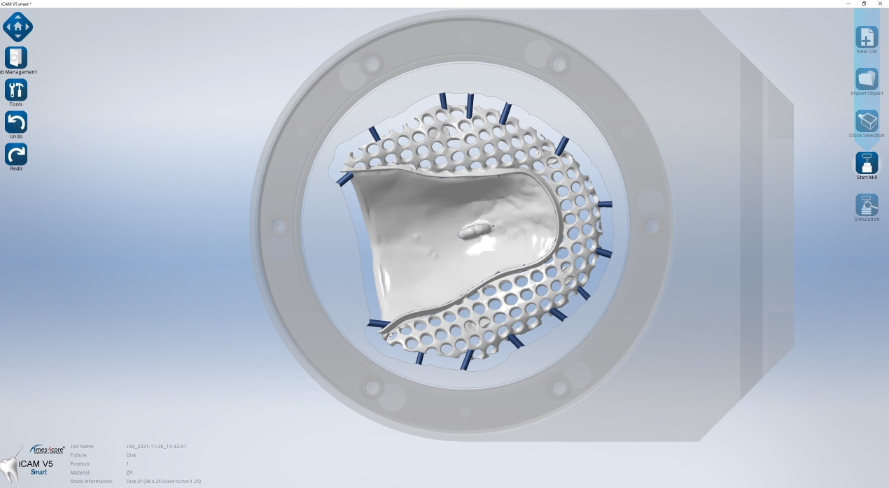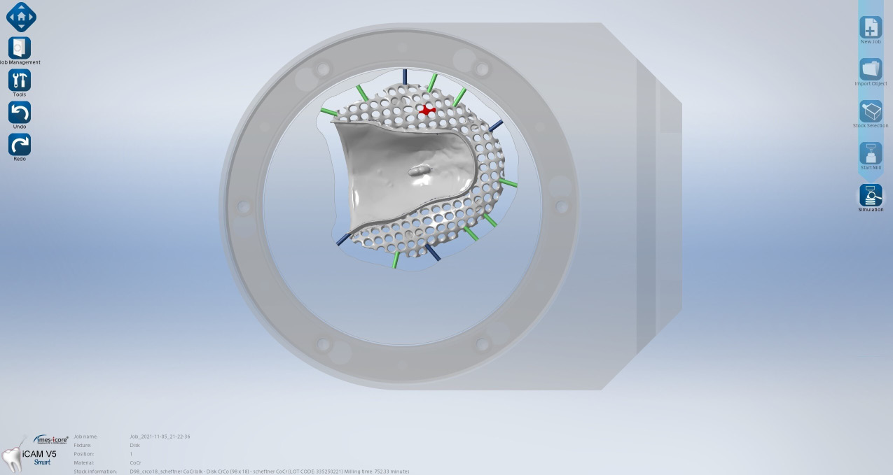 The standard tessellation language (STL) files of the design were imported into the CAM software (iCAM V5 smart; imes-icore GmbH, Eiterfeld, Germany) and milled in both Co–Cr and zirconia frameworks using a 5-axis dry and wet milling machine (CORiTEC 350i; imes-icore GmbH).