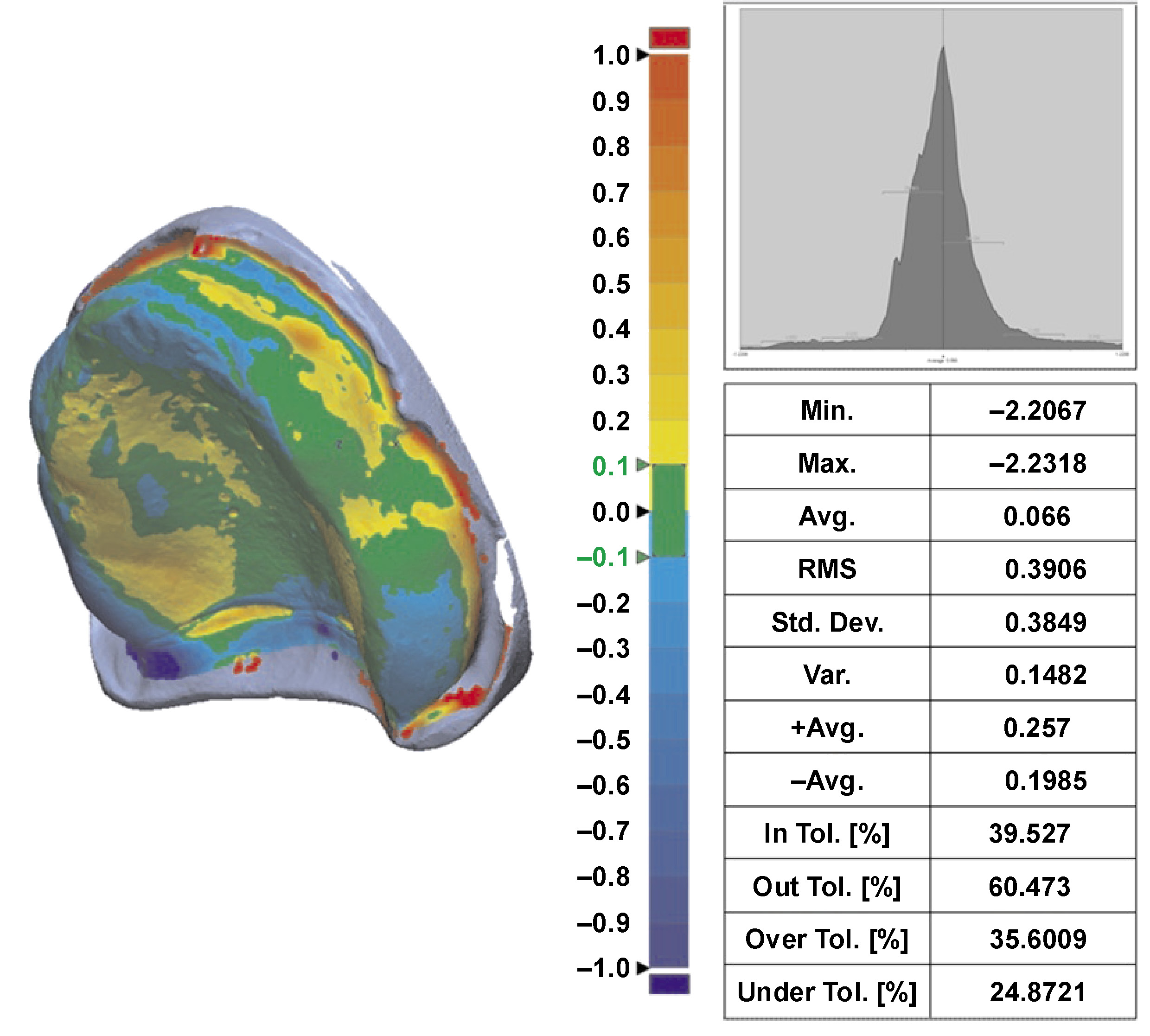 Denture adaptation was evaluated using the Geomagic software, a surface-matching program that enables superimposition of 2 surfaces to determine deviations between them.24 The calculated mean values might be close to 0, which is non-practical, indicating a perfect fit. Therefore, the root mean square (RMS) values were used to eliminate the influence of positive and negative signs.31, 32