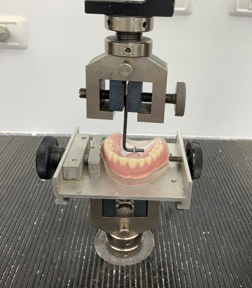A metallic ring was attached to the geometric center of the polished surface of the denture bases using self-curing acrylic resin. Artificial saliva was prepared according to the Glandosane formula by the Laboratory of the Pharmaceutical Industry at the Faculty of Pharmacy, Ain Shams University, Cairo, Egypt, and placed between the cast and the denture. A pressure of 98 N was applied to the dentures for 20 s to spread the artificial saliva uniformly across the entire mucosal surface of the denture base. The epoxy resin cast with mucosa simulation was secured to the lower component of a universal testing machine (Instron 3365; Instron®, Norwood, USA) with the palate facing upward. Tensile force was applied to the attached ring in an upward direction perpendicular to the imaginary occlusal plane (Figure 7). The crosshead speed of the universal testing machine was set at 50 mm/min. Retention was defined as the maximum traction force required to separate the denture base from the maxillary cast. The test was conducted 10 times, and the mean value of the 10 measurements was recorded as the retention force.