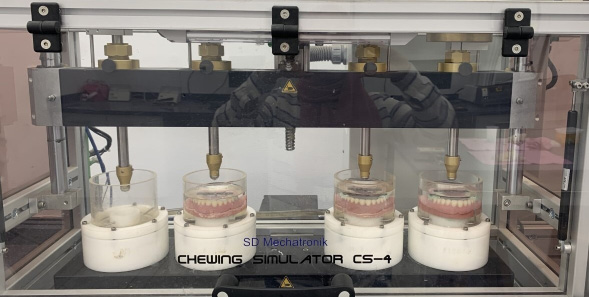 Each denture was seated on its corresponding epoxy resin cast and placed in a chewing simulator (CS-4; SD Mechatronik, Feldkirchen-Westerham, Germany) (Figure 8). Dynamic cyclic loading was applied by means of a stylus falling at the center of the metal plate that was previously attached to the occlusal surface of the denture at the center of the arch. The applied load was set at 50 N, and the software parameters were as follows: a speed of 60 mm/s; a vertical path of 3 mm; a horizontal path of 0.7 mm; and a frequency of 1.6 Hz. Each denture was subjected to biaxial cyclic loading for a total of 250,000 cycles, which represented 1 year of intraoral function.21