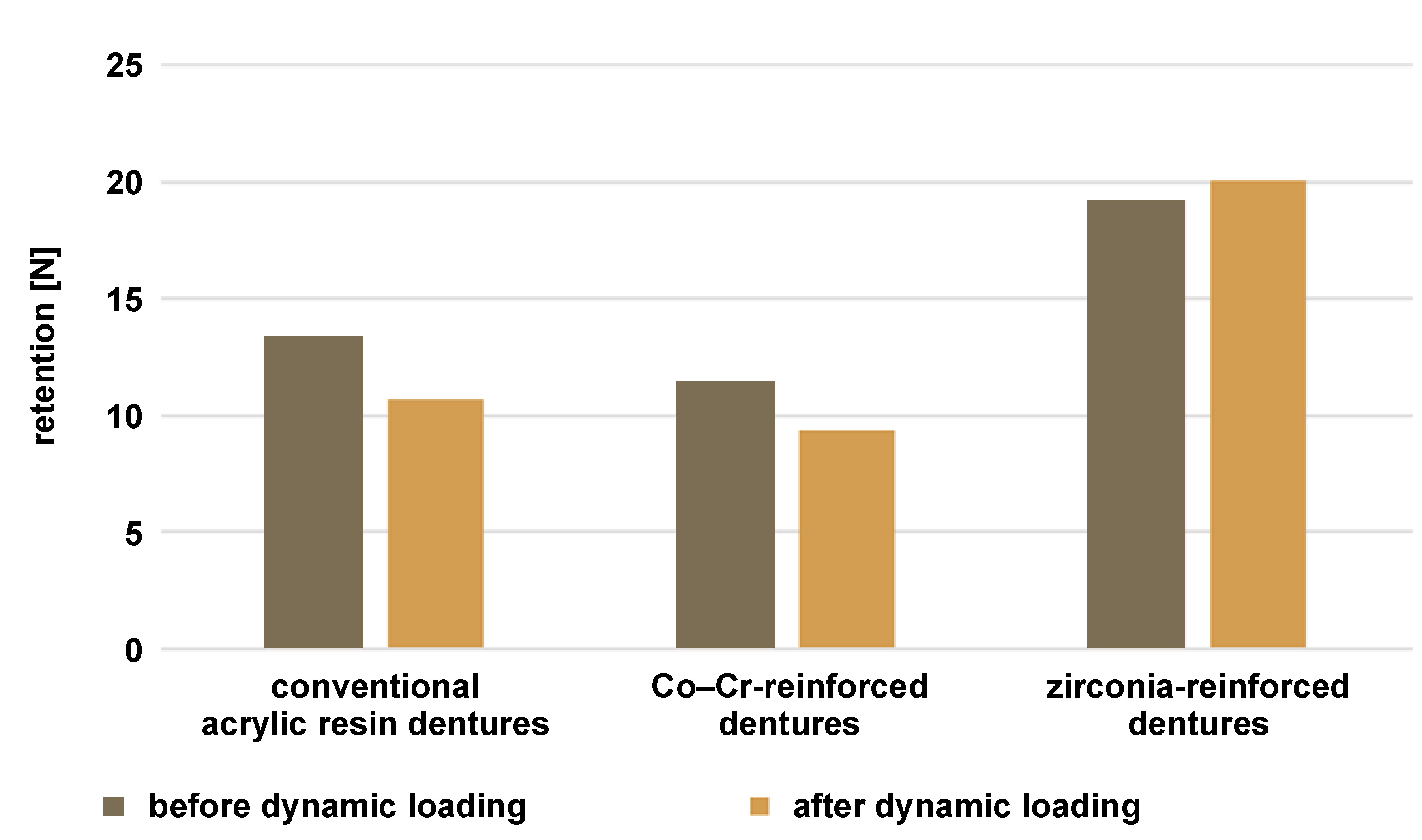 Material and methods. Three types of maxillary single dentures were constructed on maxillary master casts. Group A included maxillary dentures without reinforcement (control group), whereas groups B and C encompassed maxillary dentures reinforced with digitally designed and milled Co–Cr and zirconia frameworks, respectively (n = 13/group). Acrylic resin was conventionally processed on stone casts. Initial adaptation was evaluated for each denture using Geomagic software, which allowed for accurate matching and superimposition of the scanned master cast with the standard tessellation language (STL) file of the scanned fitting denture surface obtained with the use of a desktop scanner. Initial retention was evaluated using a universal testing machine. Dynamic fatigue loading of 50 N at a speed of 60 mm/s was applied in the chewing simulator, after which final adaptation and retention values were recorded. Paired t-tests were conducted to compare results within each group, and one-way analysis of variance (ANOVA) was performed to compare the 3 groups. When ANOVA revealed significant differences, Tukey’s honestly significant difference (HSD) test was used for post hoc pairwise comparisons. The significance level was set at p ≤ 0.05.
