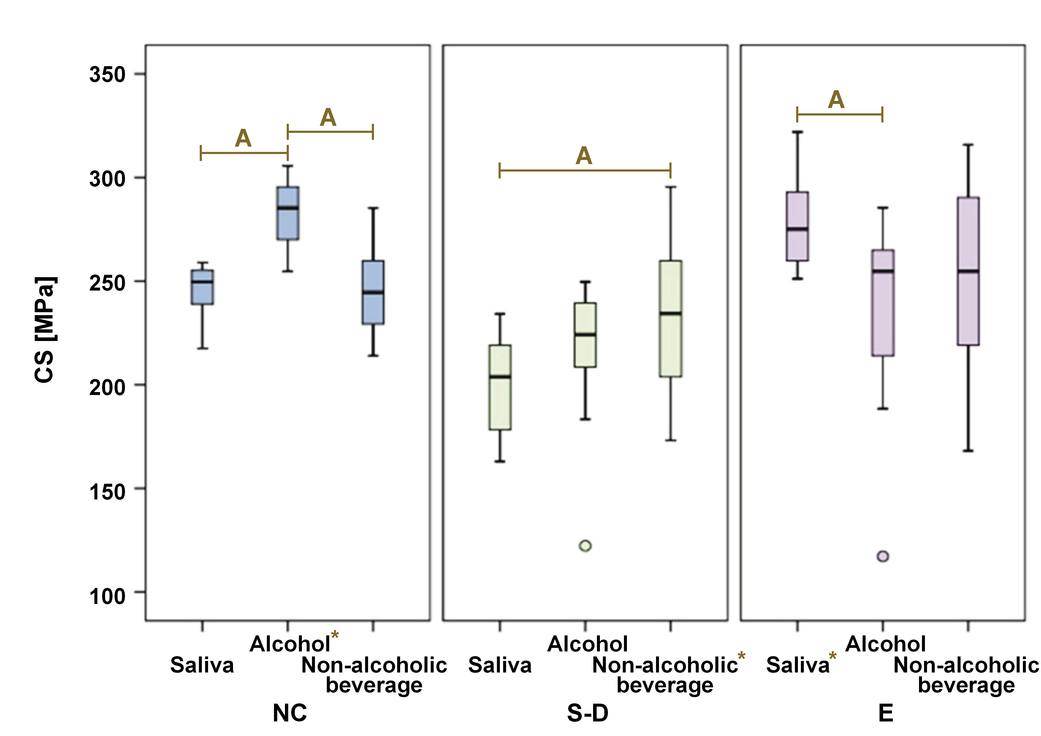 In the E group, the CS was the highest for saliva (279.4 ±22.6 MPa) and the lowest for the alcoholic liquid (236.7 ±44.0 MPa). Compressive strength was significantly higher after storage in saliva in comparison to alcohol (p = 0.015).