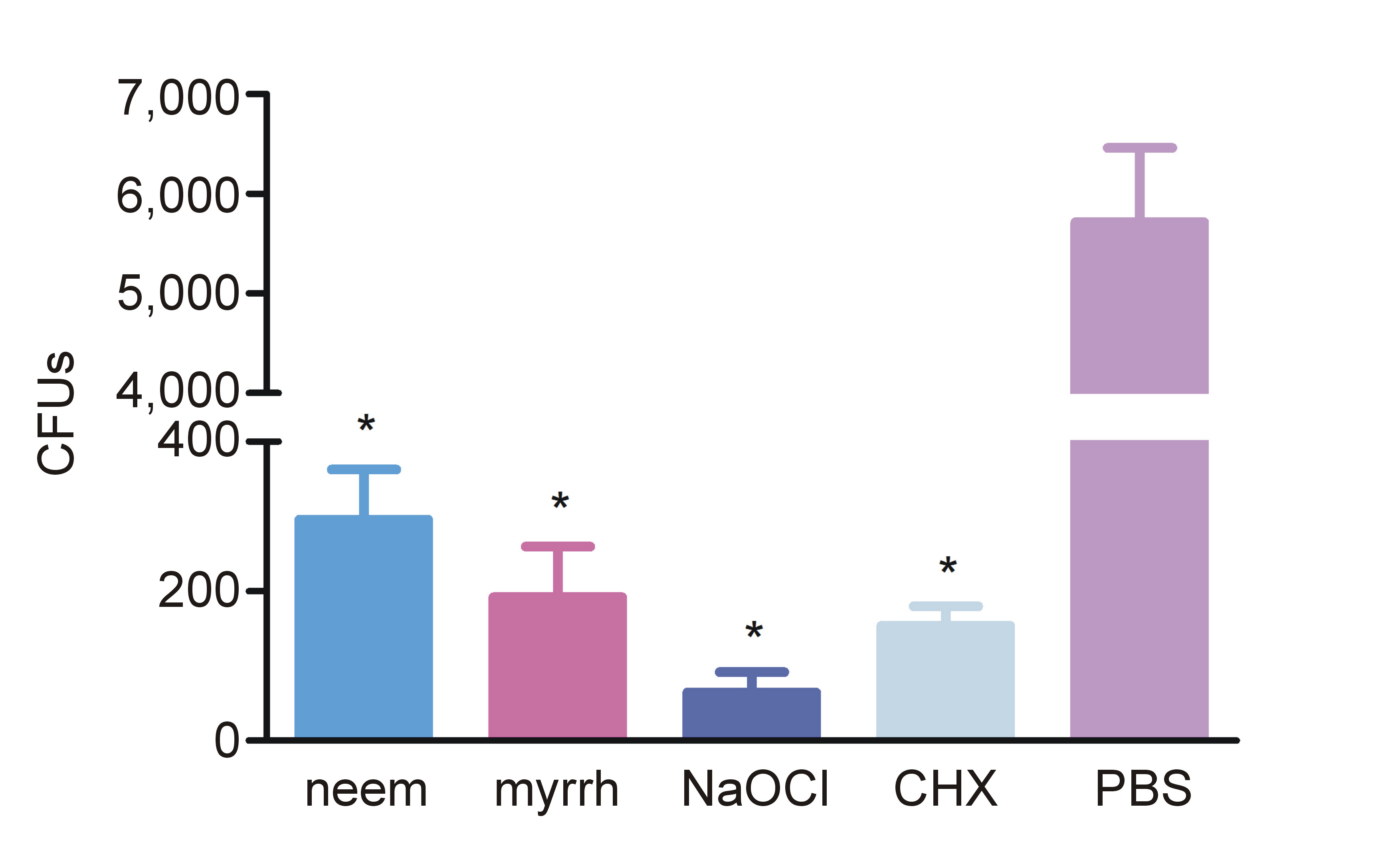 The analysis of the antibiofilm activity revealed that the mean CFU values in the neem and myrrh groups were significantly lower than those in the PBS (control) group (p < 0.001) (Figure 1). Similarly, the NaOCl and CHX groups exhibited significantly reduced CFU values in comparison to the PBS group (p < 0.001). Although the neem group demonstrated higher cfu values than the myrrh group, the difference was not statistically significant.