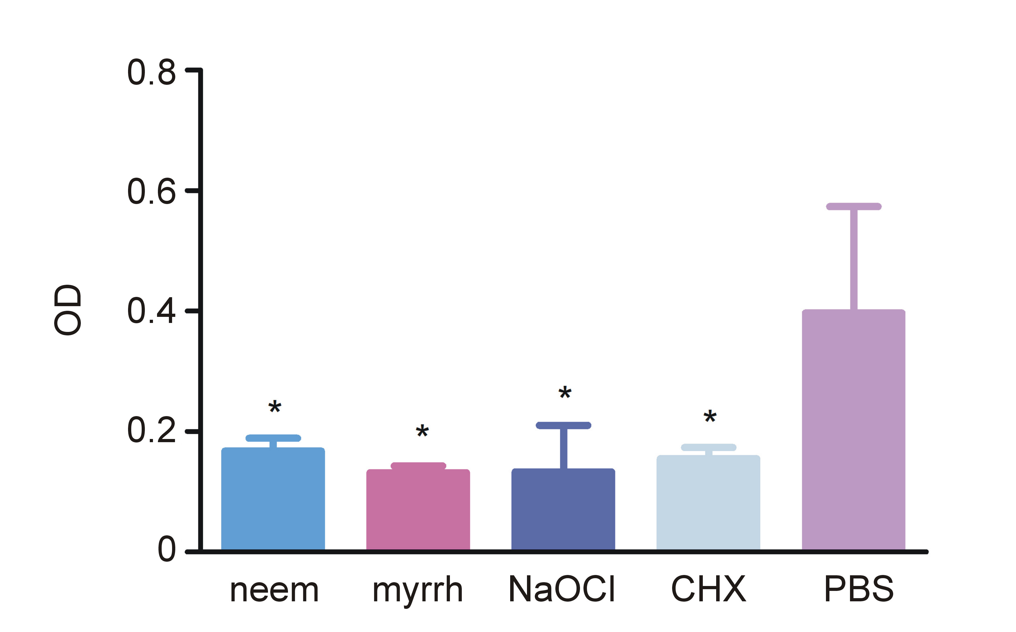 Cell counting kit-8 (CCK-8) assay results, measured at 460 nm, indicated the viability of bacterial cells in the tested and controlled groups (Figure 2). The neem, myrrh, NaOCl, and CHX groups demonstrated significantly reduced cell viability compared with the PBS group (p < 0.001). No statistically significant difference in optical density (OD) values was observed between the neem and myrrh groups.