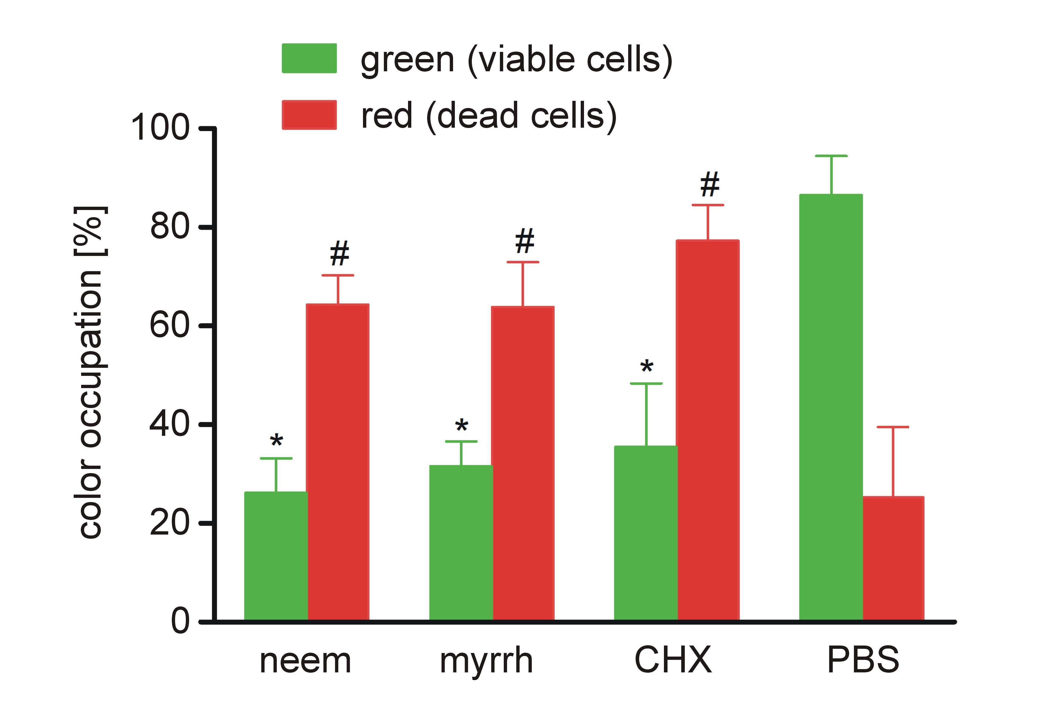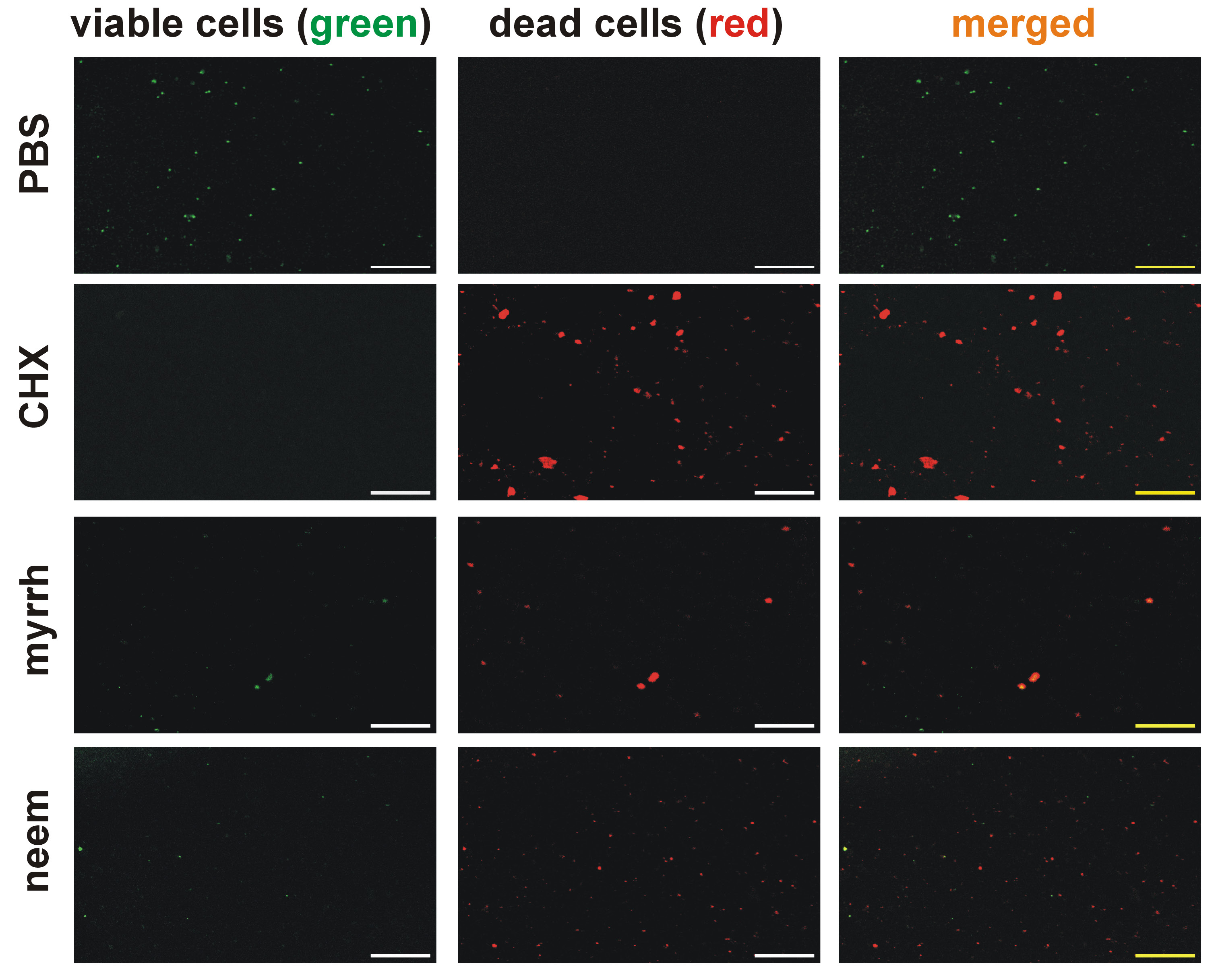 Material and methods. The minimum inhibitory concentration (MIC) and minimum bactericidal concentration (MBC) of neem and myrrh extracts against E. faecalis (ATCC 29212) were determined. Human dentin discs were prepared and inoculated with E. faecalis for 21 days. The antibiofilm activities of neem and myrrh extracts were compared using colony forming unit (CFU) assays, cell proliferation assays and live/dead fluorescence microscopy. A 5.25% sodium hypochlorite (NaOCl) solution and 2% chlorhexidine (CHX) were used as standard disinfectants.