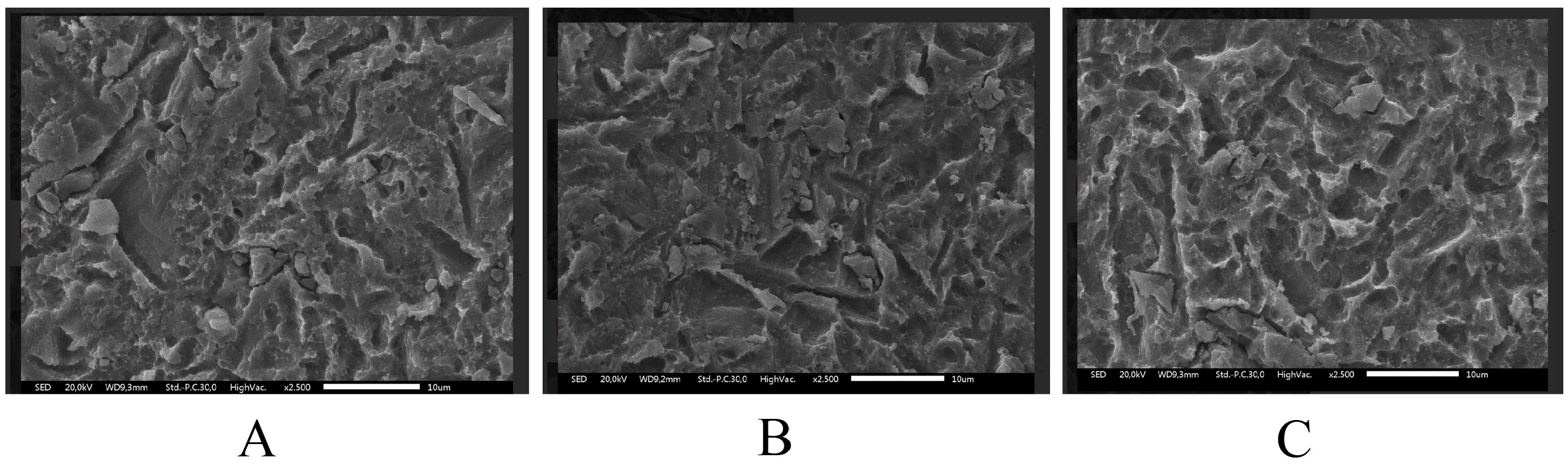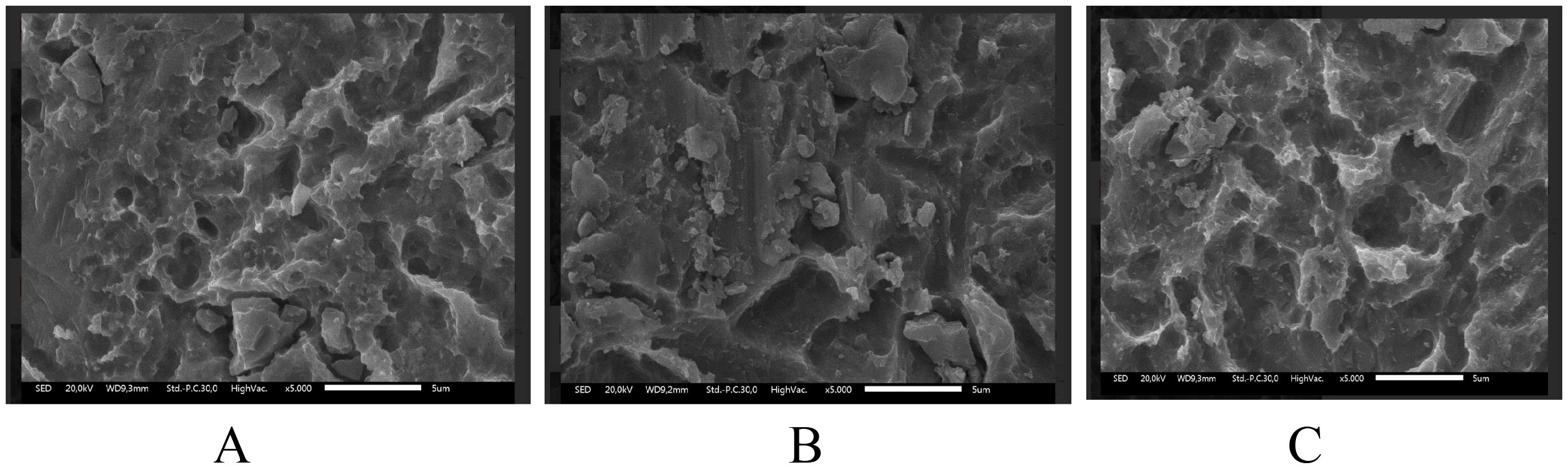 Surface morphology was observed using a scanning electron microscope (SEM) (JSM-IT300; JEOL USA Inc., Peabody, USA), with a resolution of 0.1–0.2 nm. Observations were conducted at an acceleration voltage of 10 kV with a working distance of 10 mm, using the secondary electron imaging (SEI) mode. The samples were analyzed at magnifications of ×150, ×500, ×1,000, ×2,500, ×5,000, and ×10,000.