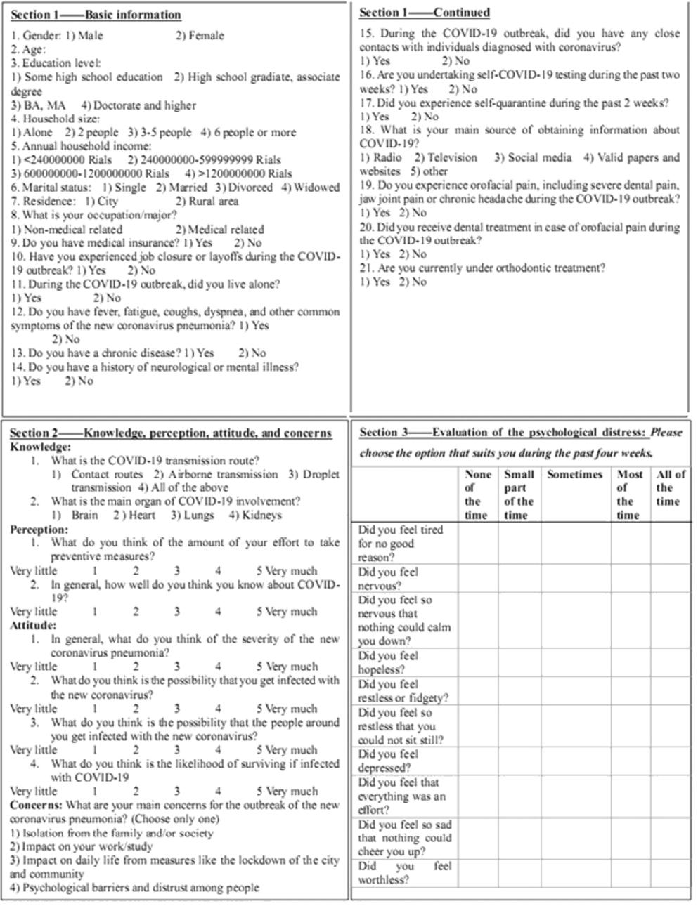 The 1st section focused on individual background information and the person’s primary source of information about COVID-19. Questions regarded the current orthodontic treatment, the current OFP and its treatment, and 6 questions related to the probability of catching coronavirus, job closure and quarantine. Questions about the exclusion criteria were also asked in this section.