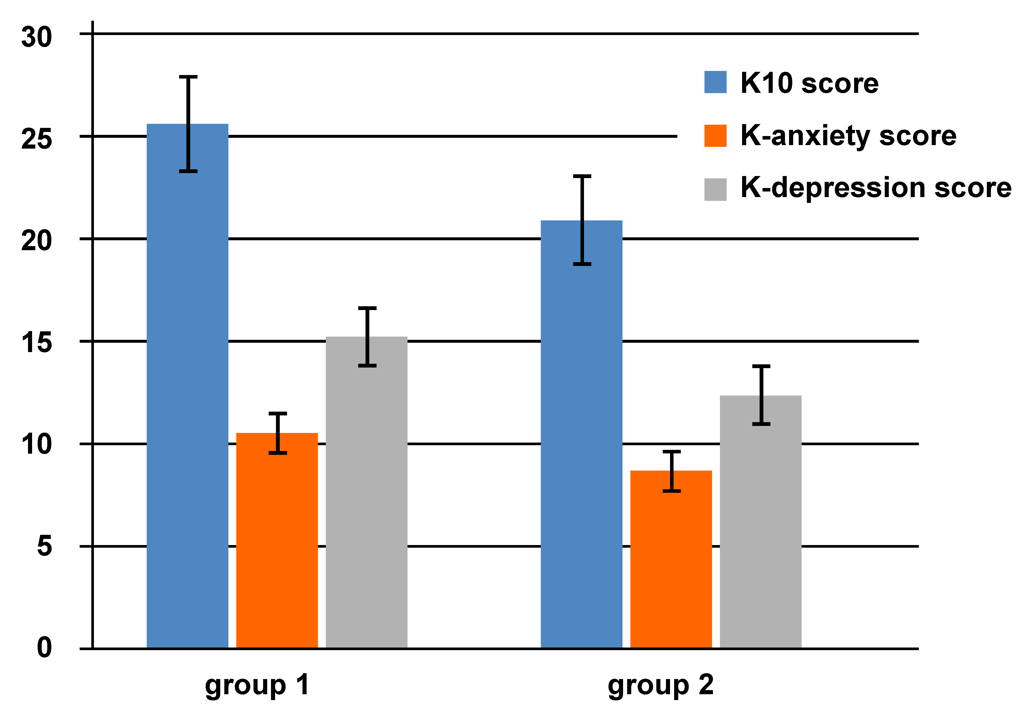 Regardless of the respondents’ group, females exhibited significantly higher K10 scale, K-anxiety and K-depression scores than males (p = 0.002, p = 0.002 and p = 0.003, respectively).