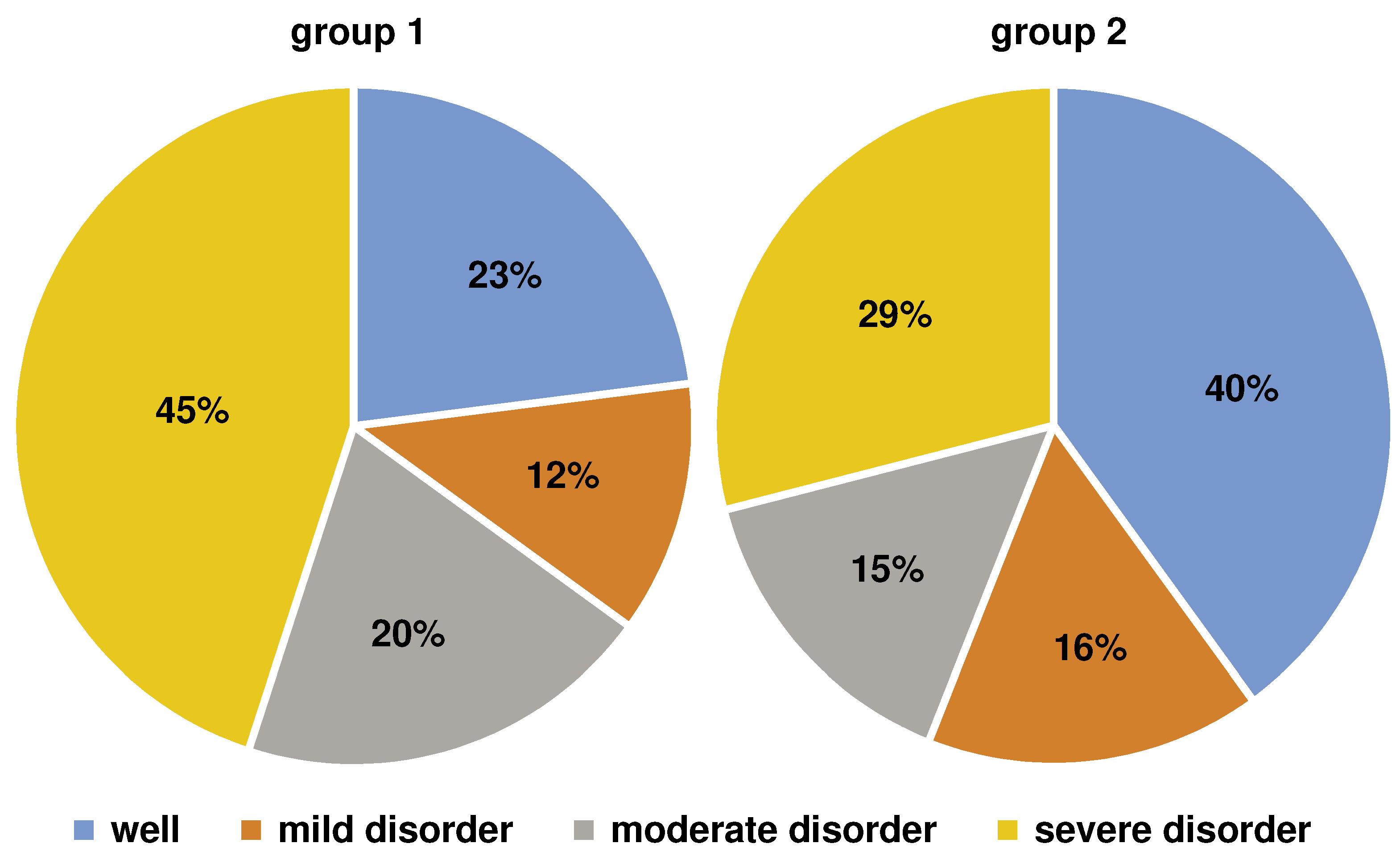A one-way ANCOVA was conducted to determine statistically significant differences between the groups in terms of the K10 scale, K-anxiety and K-depression scores, controlling for the household income. The K10 scale, K-anxiety and K-depression scores were significantly higher in group 1 than in group 2 (p = 0.0001; FK10 = 18.31; FK-anxiety = 16.06; FK-depression = 18.29) (Figure 2). Group 1 exhibited a significantly higher percentage of individuals with mental distress than group 2 (p = 0.047) (Figure 3).