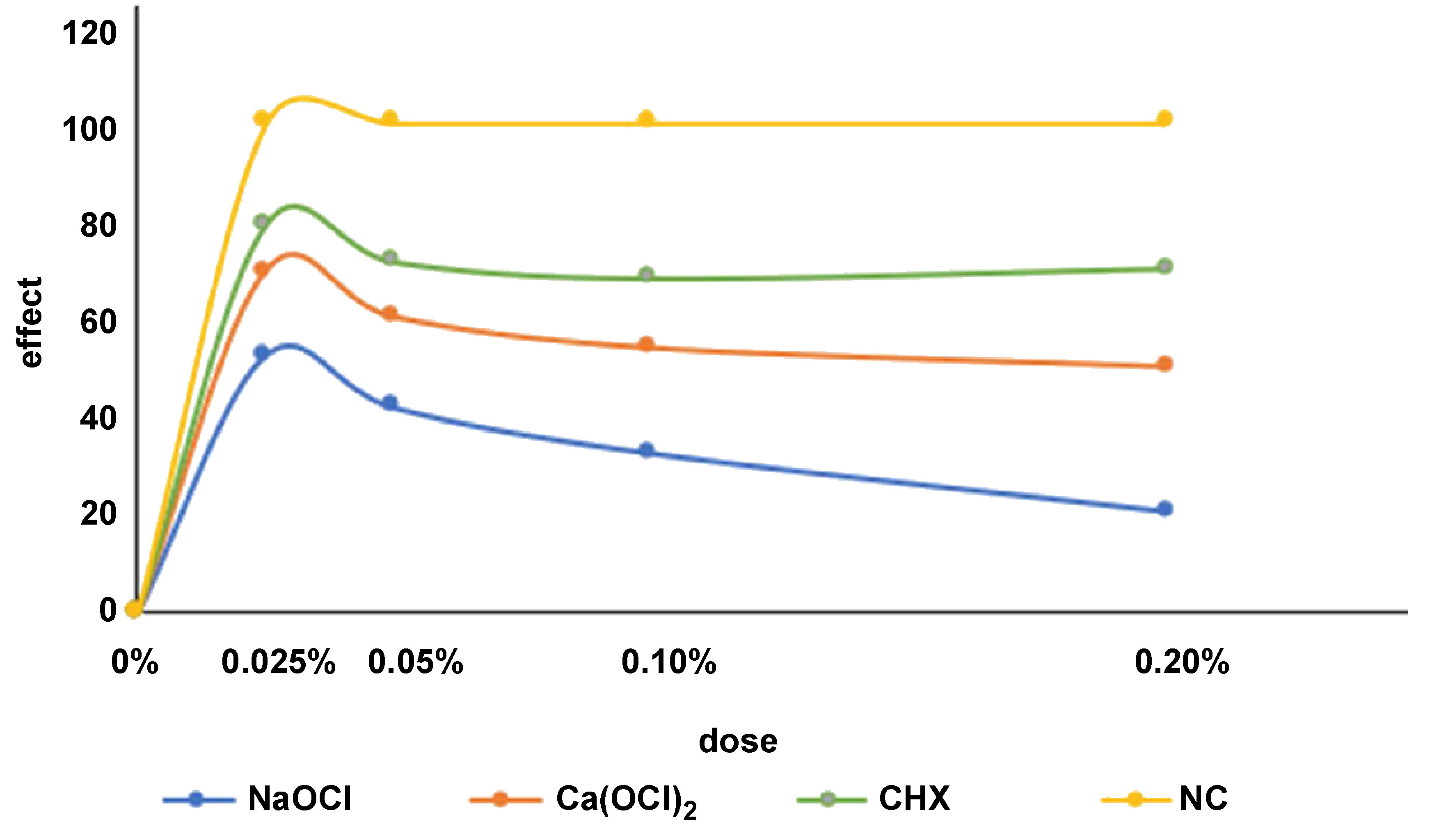 The comparison of absorbance at the 0.050% concentration showed statistically significant differences in the following cases: NaOCl vs Ca(OCl)2 (p = 0.001); NaOCl vs NC (p = 0.001); Ca(OCl)2 vs CHX (p = 0.001); Ca(OCl)2 vs NC (p = 0.001); and CHX vs NC (p = 0.001). At the 0.10% concentration, differences in absorbance were observed to be statistically significant for NaOCl vs Ca(OCl)2 (p = 0.001), NaOCl vs NC (p = 0.001), Ca(OCl)2 vs CHX (p = 0.001), Ca(OCl)2 vs NC (p = 0.002), and CHX vs NC (p = 0.001). At the 0.20% concentration, the comparison of absorbance showed statistically significant differences for NaOCl vs Ca(OCl)2 (p = 0.001), NaOCl vs NC (p = 0.001), Ca(OCl)2 vs CHX (p = 0.005), Ca(OCl)2 vs NC (p = 0.006), and CHX vs NC (p = 0.001).