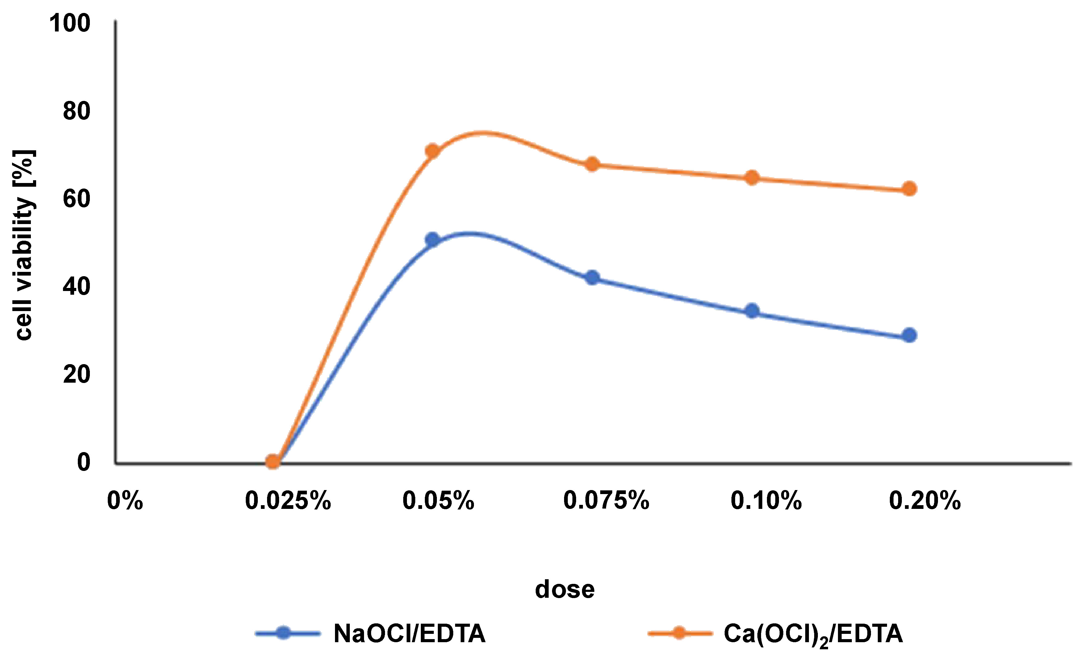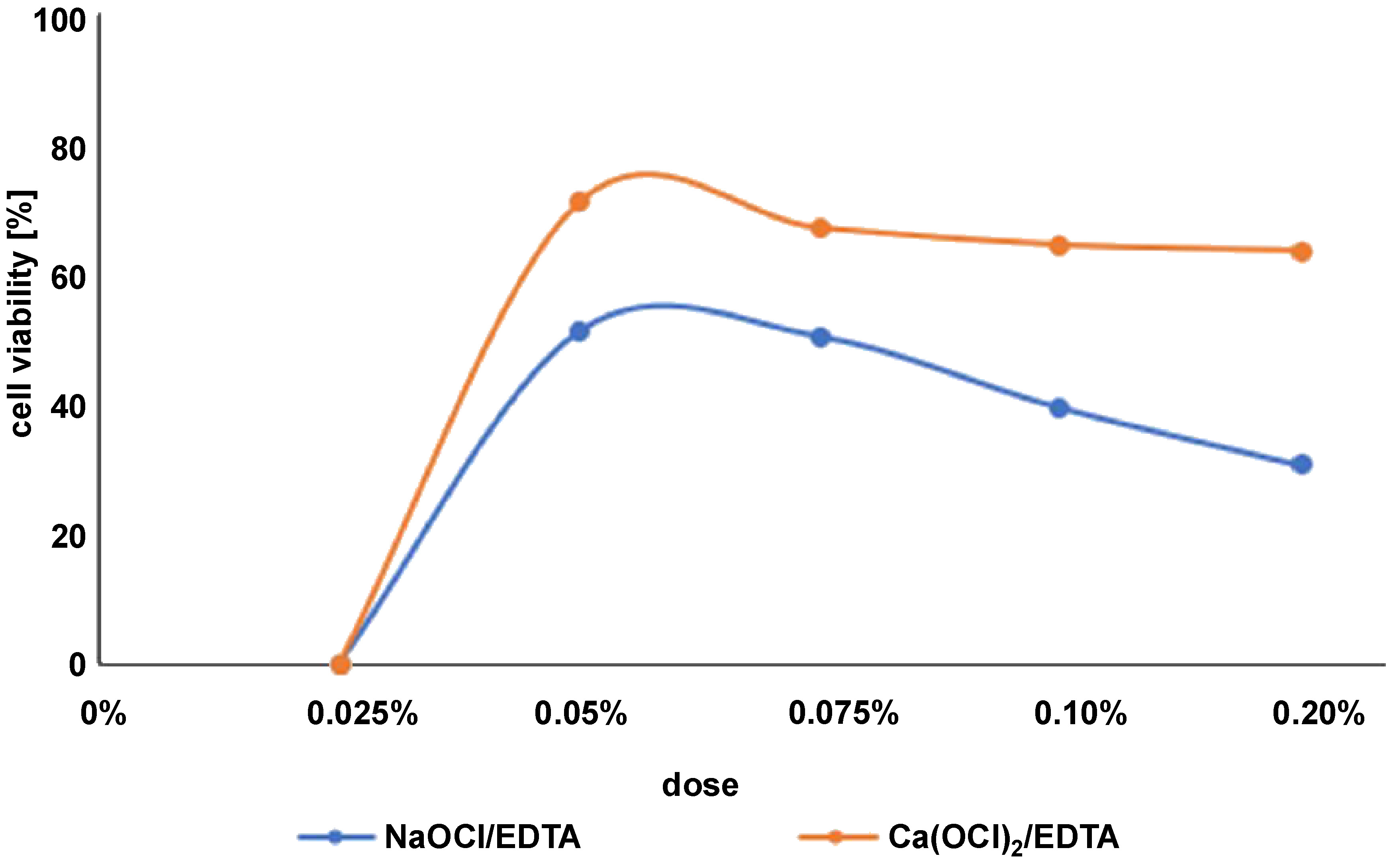 Conclusions. Calcium hypochlorite is less cytotoxic than NaOCl, and when used in combination with EDTA, it was shown to have its cytotoxic effect on hGF cells reduced to a great extent.