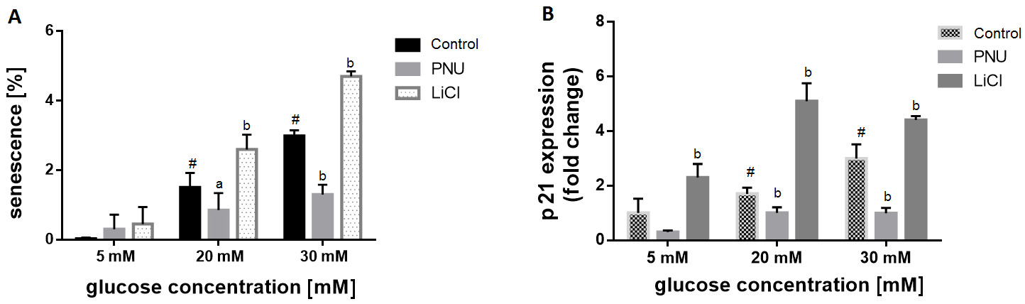 To evaluate the role of Wnt signaling in the glucose-induced senescence response, the cells were treated with beta-catenin inhibitor – PNU-74654 – and beta-catenin inducer – LiCl. The results showed that LiCl aggravated cellular senescence in the presence of high concentrations of glucose (20 mM and 30 mM). Also, an increased percentage of senescent cells alleviated in the presence of PNU-74654 (10 µM) at high glucose concentrations (Figure 5A). Similarly, LiCl induced p21 expression, while exposure to PNU-74654 reduced the p21 level under hyperglycemic conditions, as measured by qRT-PCR (Figure 5B).