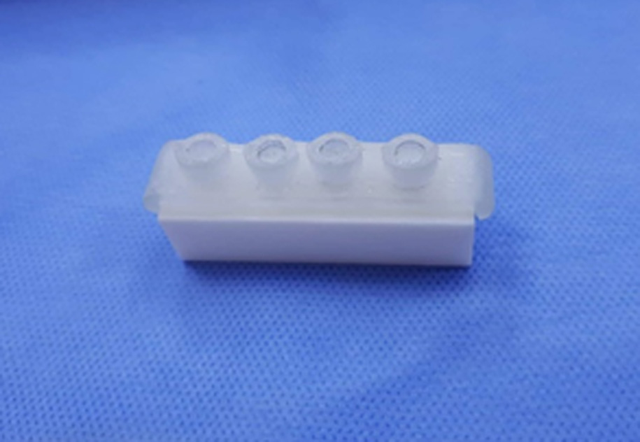 The study sample consisted of 80 measurement sites placed near 40 dental implant sockets, which were prepared on 10 artificial-bone blocks similar to human D2 bone (solid rigid polyurethane foam; Alexandria Industries, Taipei, Taiwan). These models were divided into 5 models for the conventional method group and 5 models for the surgical guide group (Figure 1). Each model had 4 implant sockets prepared, and then two 1-millimeter-wide holes were drilled 1 mm away from the socket on the opposite sides