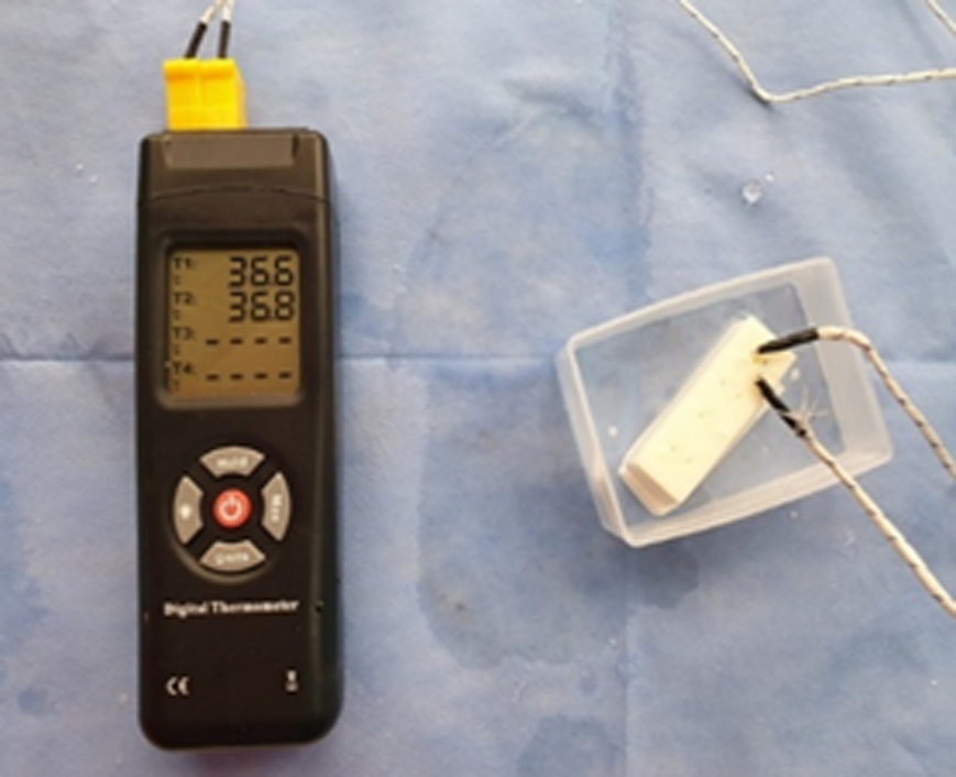 Each bone block was placed in an aqueous medium of a temperature similar to body temperature (37°C),9 then a thermometer (Thermocouple Type K device; Danoplus, Hong Kong, China) was placed inside the measurement sites and the temperature was recorded (Figure 4). The implant motor (X-Cube implant motor system; Dentis, Daegu, South Korea) was set to 1,200 rpm, 30 N and 85% irrigation for the preparation of all implant sites.