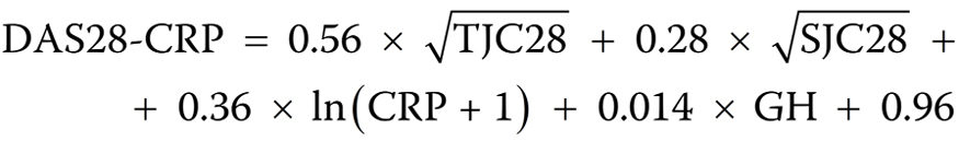 Rheumatoid arthritis disease activity was measured as in our previous study.8 We assessed RA disease activity based on CRP (DAS28-CRP), with the following equation (Equation 1):