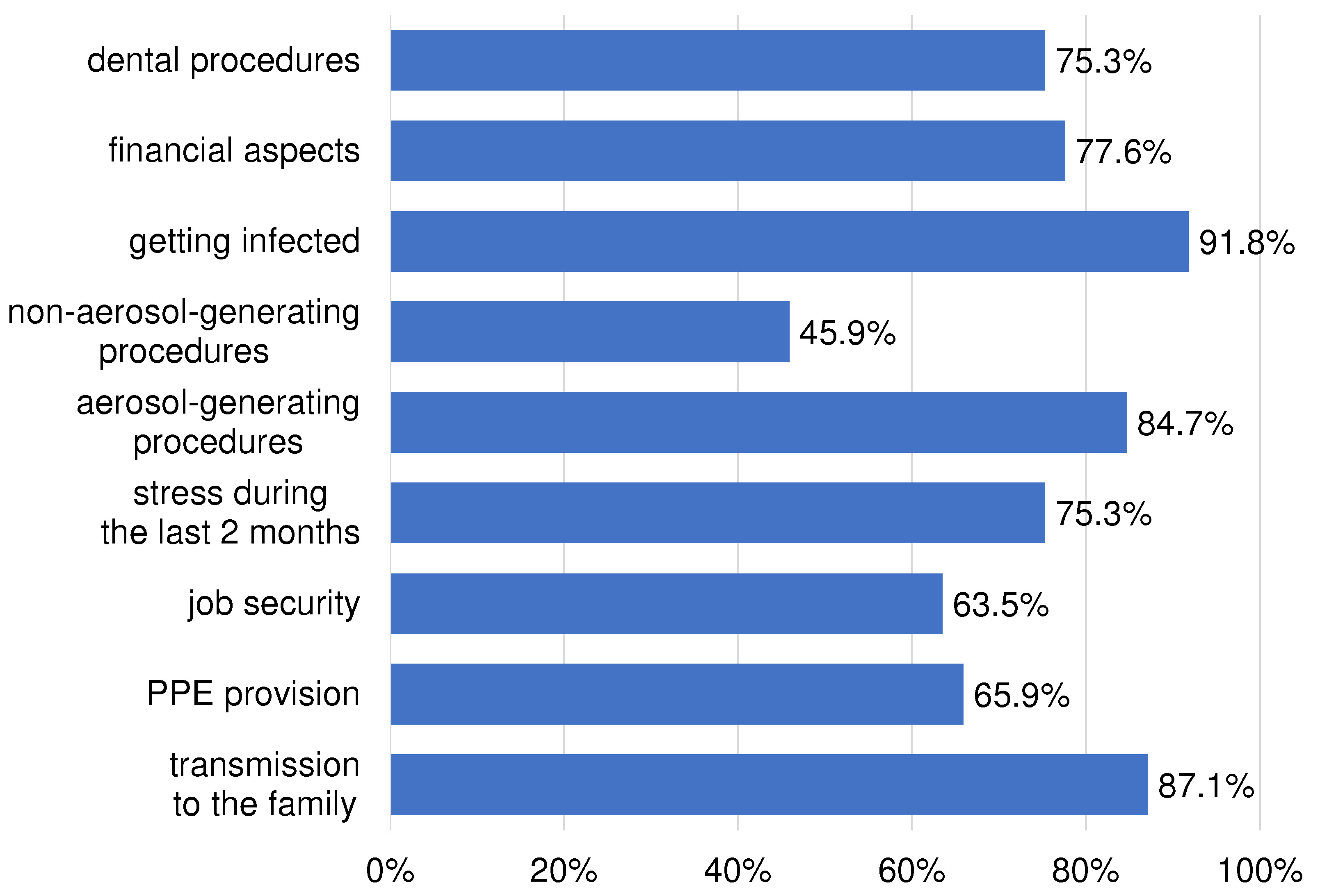The risk of infection with COVID-19 for healthcare providers has raised stress and anxiety among dental professionals.10, 11 The literature lacks data on the COVID-19 infection rates among dentists; only a few surveys have been conducted, finding less than 1% of dentists affected by the disease.12, 13 These surveys highlight the dentists’ perception of COVID-19 and the precautionary measures taken by them to prevent disease transmission.