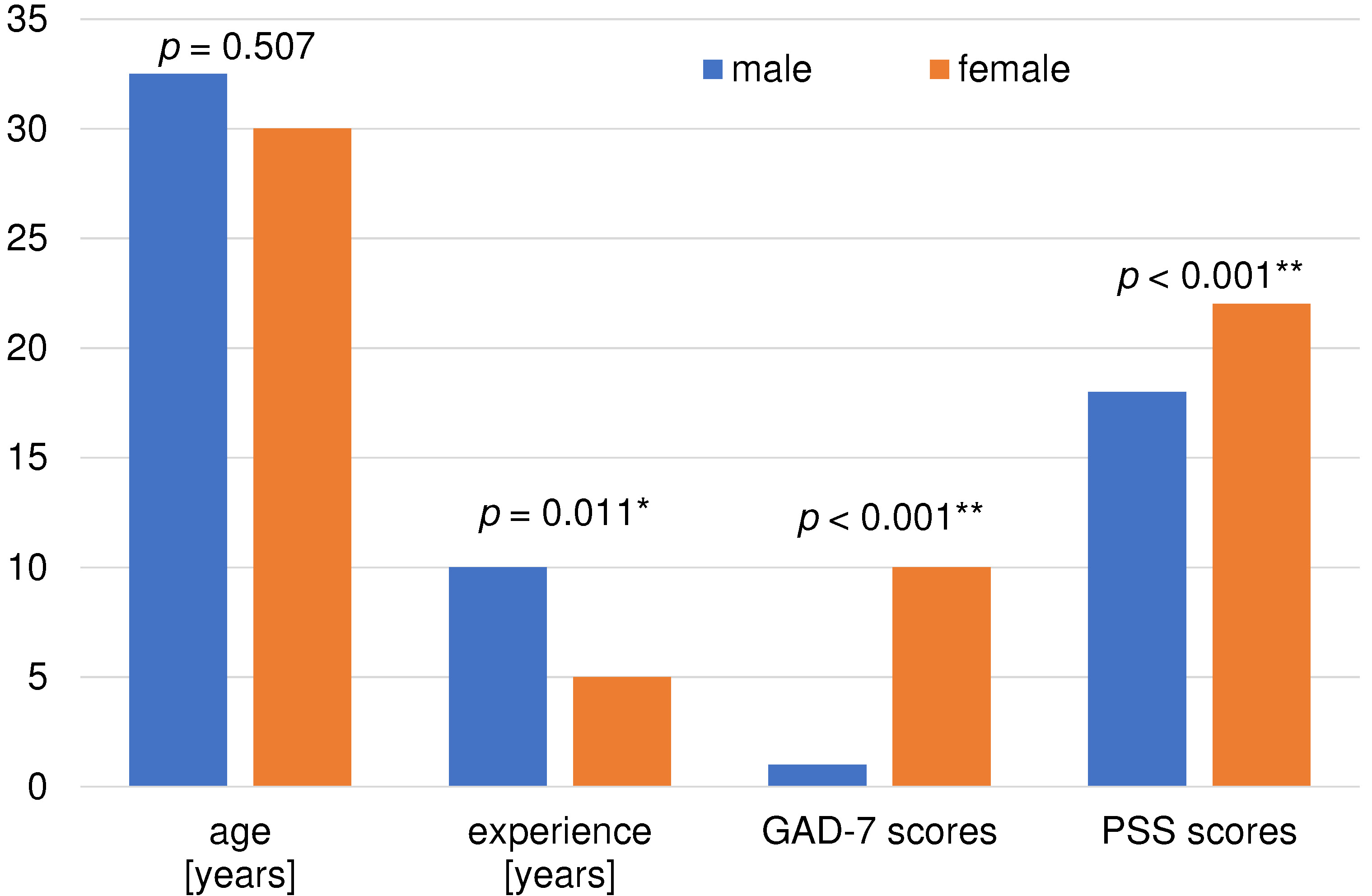 Eighty-five participants (32 males, 53 females) completed our survey and were included in this study. They were of a mean age of 31.6 ±6.0 years. The distribution of dental professionals who participated in the survey was as follows: dental assistants – 28% (18 males, 6 females); general dentists – 29% (4 males, 21 females); maxillofacial surgeons – 8% (2 males, 5 females); operative dentists – 9% (2 males, 6 females); orthodontists – 20% (5 males, 12 females); and prosthodontists – 5% (1 male, 3 females). Figure 1 presents reasons for stress and anxiety among dental healthcare workers. Significant differences were found between genders in the experience (p = 0.011), GAD-7 (p < 0.001) and PSS (p < 0.001) scores (Figure 2). Further comparisons were made after the stratification of data with respect to gender. The comparison of the PSS scores among the 3 male healthcare worker groups showed significant differences (p = 0.021). Also, the comparison of the PSS and GAD-7 scores among the 3 female healthcare worker groups showed significant differences (p = 0.012 and p = 0.037, respectively) (Table 1).