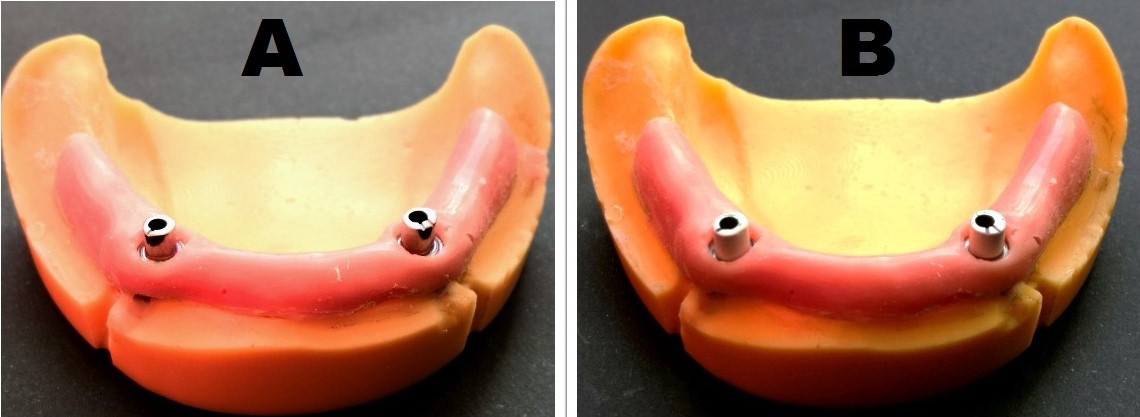 A three-dimensional (3D) model of a completely edentulous mandible was designed with 2 implant beds in the canine region, equidistant from the midline and perpendicularly aligned to the ultimate occlusal plane to accommodate two 4.2 mm × 10 mm implants. A layer of a 2-millimeter thickness was removed from the surface of the model to be replaced with mucosa-simulating material later on. Twelve models were printed by means of an additive manufacturing technology. Two 4.2 mm × 10 mm implants were cemented at their planned sites in each model with a delicate layer of cyanoacrylate adhesive cement.