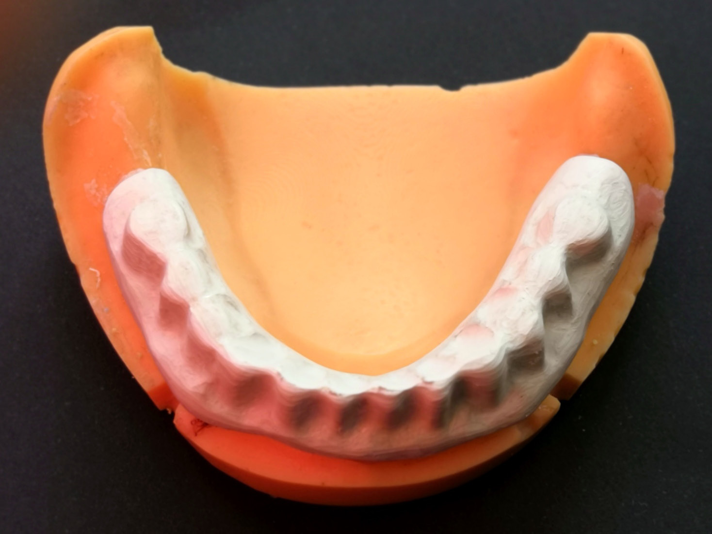 A wax pattern of a telescopic overdenture extending from the right first molar site to the left first molar site, including the secondary copings, was done for each model. The wax patterns were then invested and burnt out, and then BioHPP pellets were pressed using the for-2-press system to produce BioHPP frameworks. Each framework was finished and polished, and then returned to its model. Figure 2 shows the final BioHPP telescopic overdenture framework.