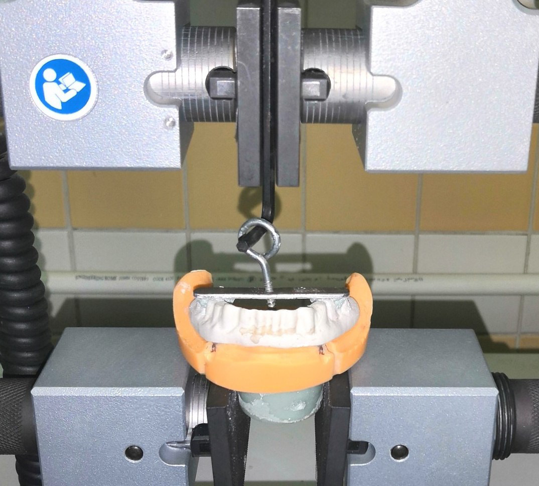 A universal testing machine (Lloyd Instruments, Bognor Regis, UK) was used to apply vertical dislodging forces on a horizontal metal plate. A central hook was attached to the occlusal surface of each overdenture at a position 13 mm distal to the line passing through the implant center until it was elevated from its seating position. All groups were tested under the same conditions, i.e., moistening of the abutments and the fitting surface of the overdenture with artificial saliva (Glandosane®; STADAPHARM, Laichingen, Germany), as recommended by Bayer et al.,19 and loading the overdenture with a compressive pre-weight of 50 N for 20 s. The machine was set at a constant crosshead speed of 50 mm/min. The initial pull-off test was done and maximum tensile loads needed to dislodge the overdentures from the cast model were calculated in newtons. Three measurements were performed for each overdenture and their mean was considered as the initial retentive value. Figure 3 shows the initial pull-off test.