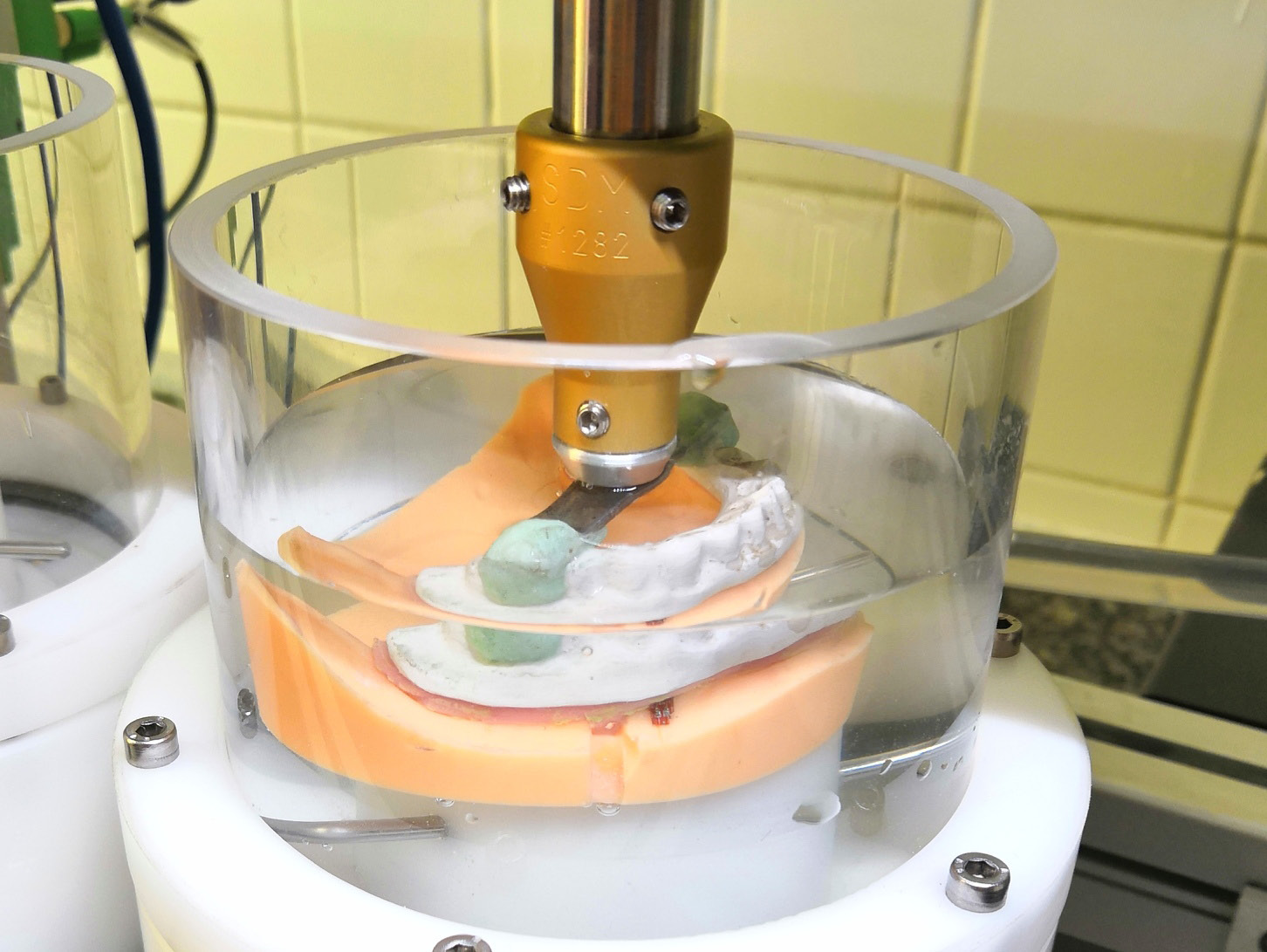 A chewing simulator (CS-4.4; SD Mechatronic, Munich, Germany) was used to apply dynamic/cyclic loading to each overdenture. The exact point of load application was marked at the center of the horizontal metal plate which was attached to the occlusal surface of each overdenture, as shown in Figure 4. All groups were tested under the same conditions, i.e., filling the specimen chamber with artificial saliva and load settings of 49 N. The software parameters were set at 60 mm/s, 3 mm vertical path, 0.7 mm horizontal path, and 1.6 Hz according to the settings used in the previous studies which used implant-retained overdenture models.20, 21 Each overdenture was subjected to bi-axial cyclic loading for a total of 240,000 cycles in wet conditions at room temperature.