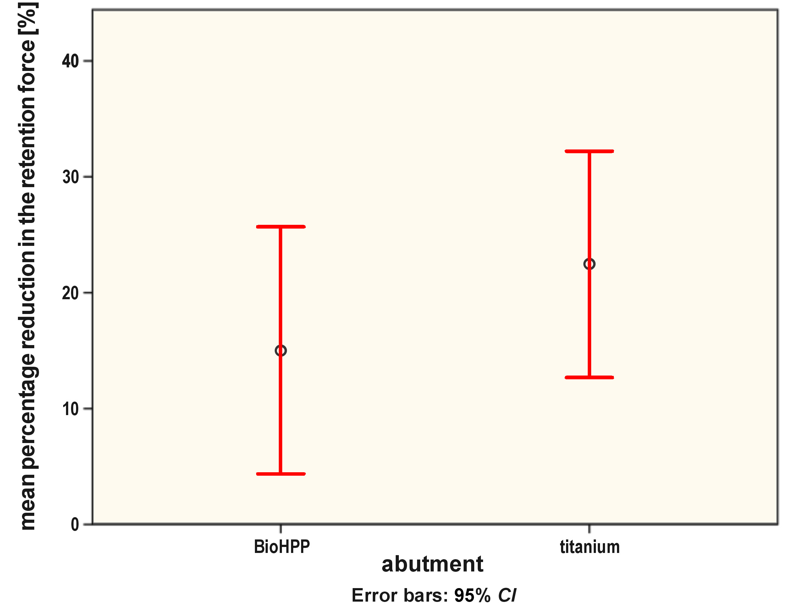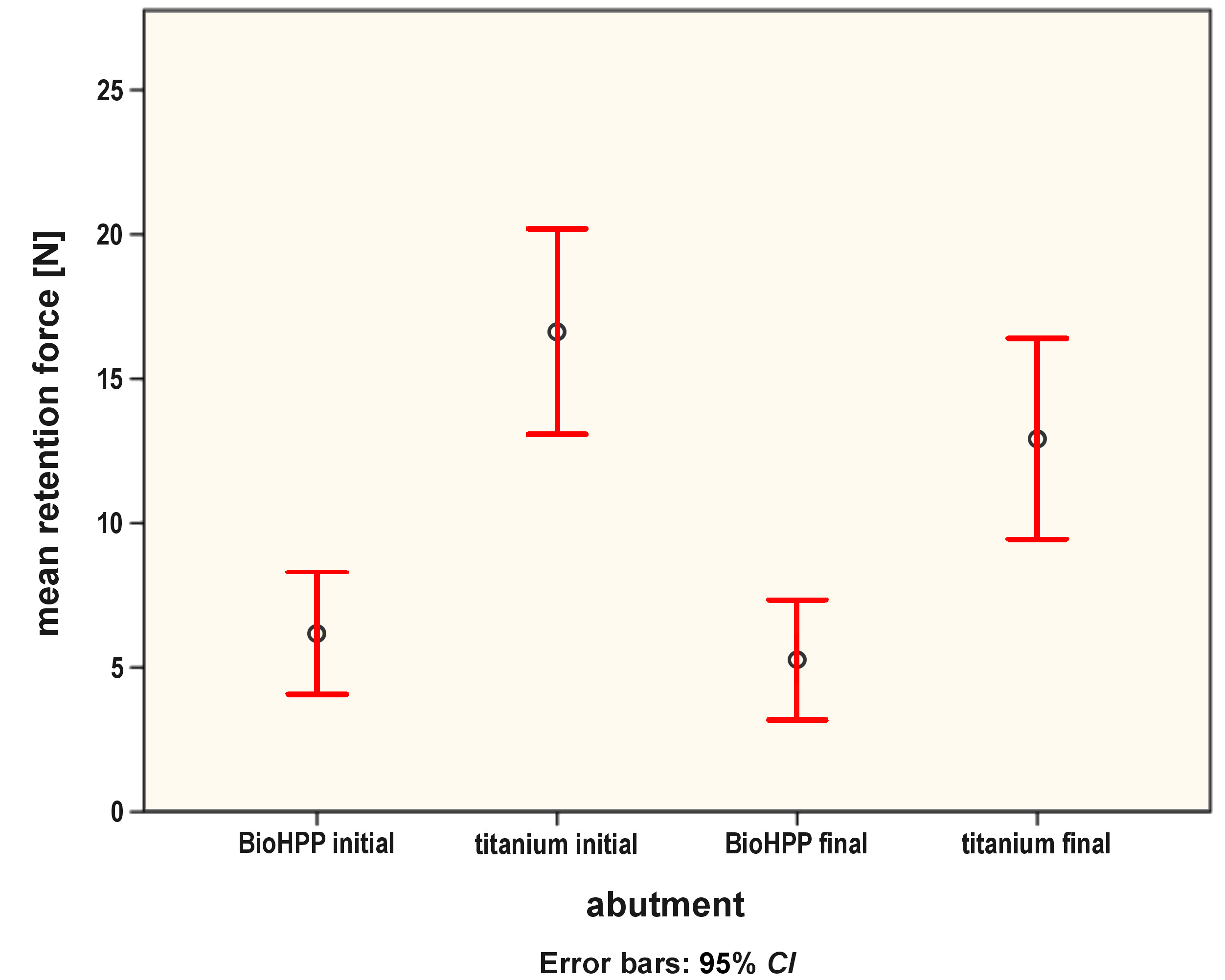 Our results rejected the null hypothesis, as they revealed higher initial and final retentive force values in the Ti group over the Bio group. The difference in the initial retentive forces could be attributed to the pressing process of BioHPP abutments, which was complicated, with many potential sources for errors. Also, the higher final retentive force values in the Ti group could be due to the already higher initial retentive forces as compared to the Bio group.