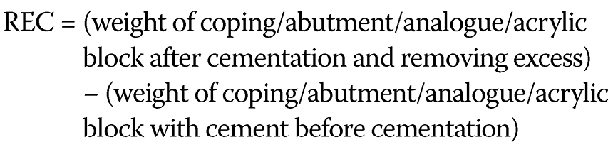 Material and methods. Seventy-two straight abutments were categorized into 4 groups: vertical groove; 1 horizontal groove; 2 horizontal grooves; and ccontrol (with no geometric changes in the abutment). The access hole was partially filled and the cast copings were cemented using Temp-Bond™ NE, a non-eugenol cement. The difference in weight before and after removing the excess cement was considered as REC. Furthermore, the retention of the cast coping was measured as the force that was required to separate the cemented cast coping from the abutment.