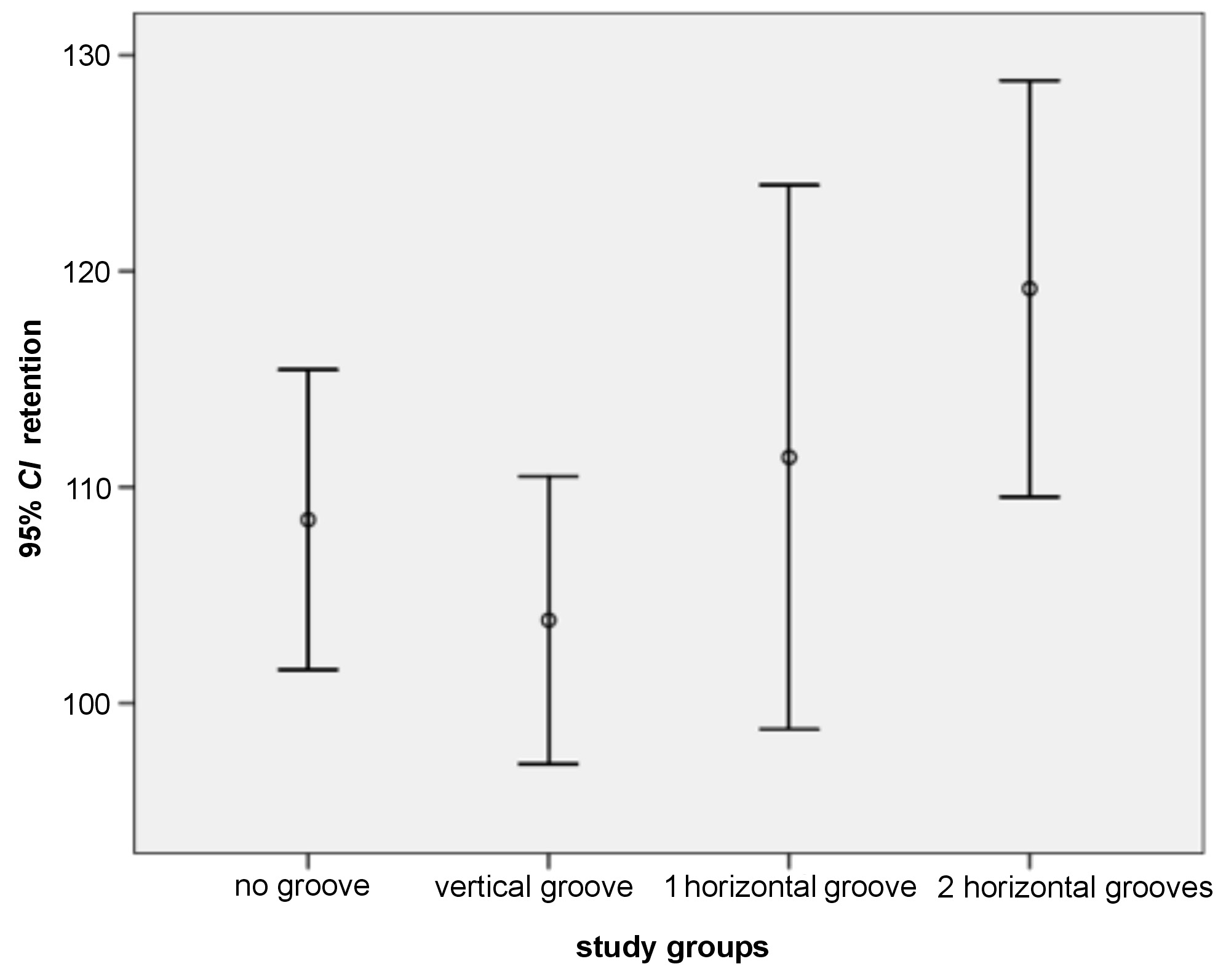 The M and SD values for the 2 variables – REC and retention – in the study groups are presented in Table 1. We found that the mean REC value was the highest in the ‘no groove’ control group. Group 3 (2 horizontal grooves) showed the lowest mean REC value. The mean retention value was the highest in group 3 (2 horizontal grooves)and the lowest in group 1 (vertical groove).