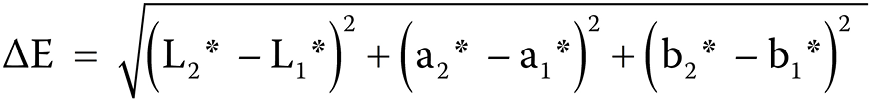 L2*, a2*, b2* – CIE L* a* b* values measured at time periods (ΔL = L2* − L1*; Δa = a2* − a1*; and Δb = b2* − b1*).