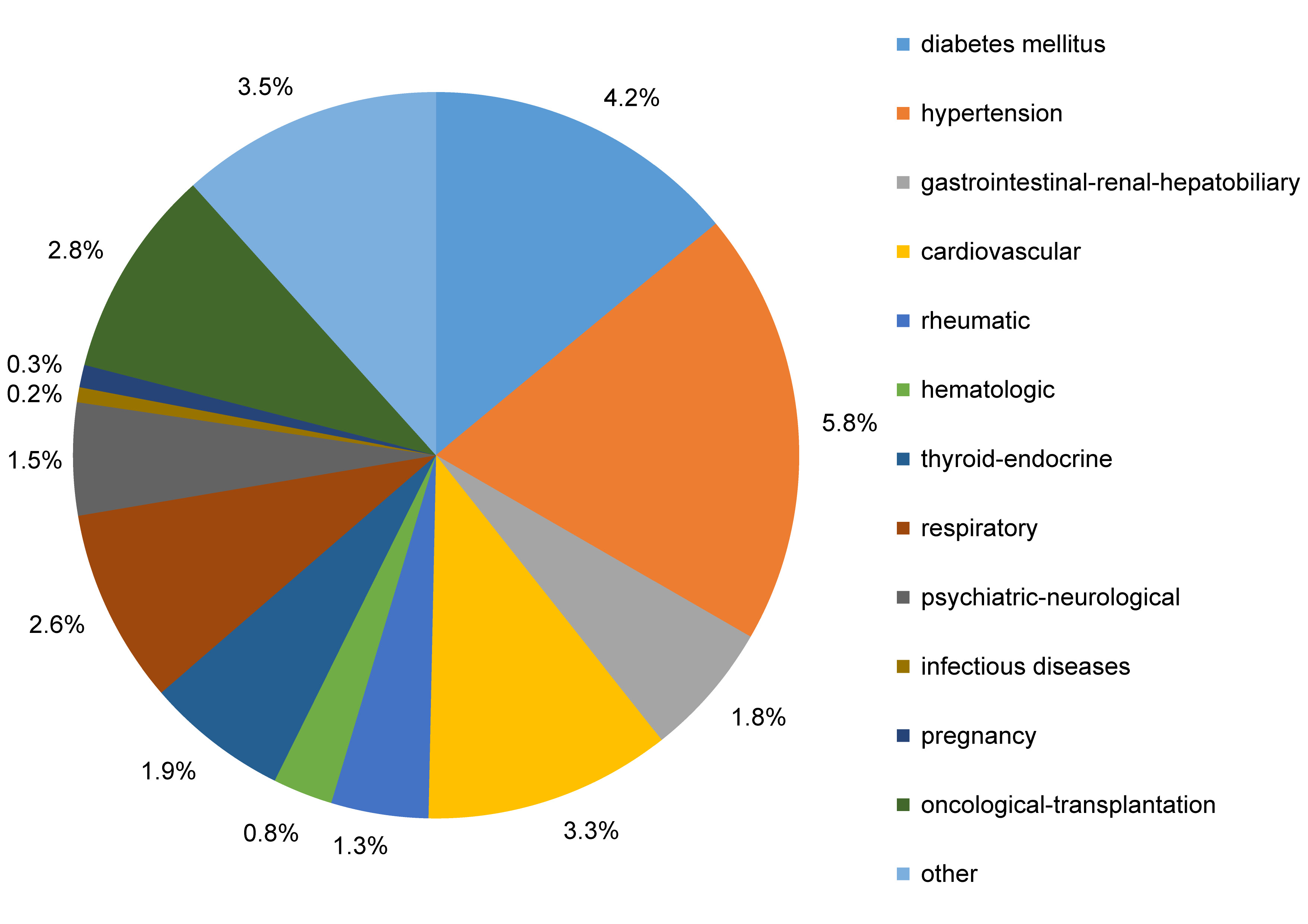 Overall, 1,644 patients attended the emergency clinic at the Department of Dentomaxillofacial Radiology within the chosen time period. Out of these, 205 patients decided not to participate in the study, and a total of 1,439 patients (595 males and 844 females) were included. The age of the patients ranged between 18 and 68 years, with a mean age of 34.8 ±14.2 years. The demographic characteristics of the sample are presented in Table 1. A total of 333 patients (23.1%) had 1 or more chronic diseases or other systemic conditions (Table 1). Hypertension (n = 83; 5.8%) was the most common disease followed by diabetes mellitus (n = 61; 4.2%) (Figure 1).