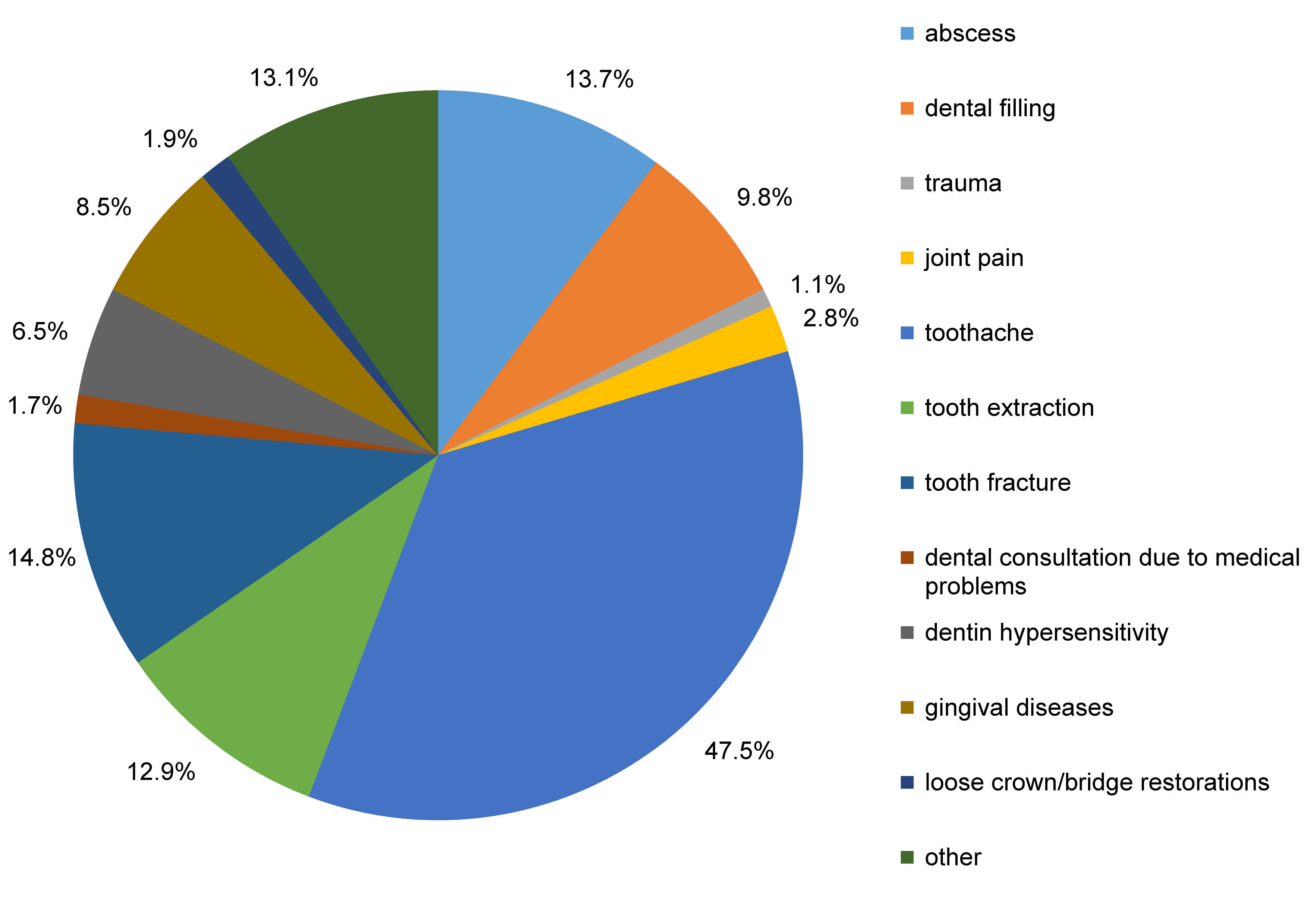 One thousand and ninety-one patients (75.8%) stated that they reported to the dentist due to a complaint, with 214 (14.9%) visiting occasionally and 134 (9.3%) visiting regularly. The most common reasons for the emergency dental visit were toothache (47.5%) followed by tooth fracture (14.8%), abscess (13.7%) and tooth extraction (12.9%) (Figure 2). Based on the scores obtained from the visual pain scale, more than half of the patients (n = 738; 51.3%) presented with severe pain, 364 (25.3%) with moderate pain, 77 (5.4%) with mild pain, and 260 (18.1%) with no pain.