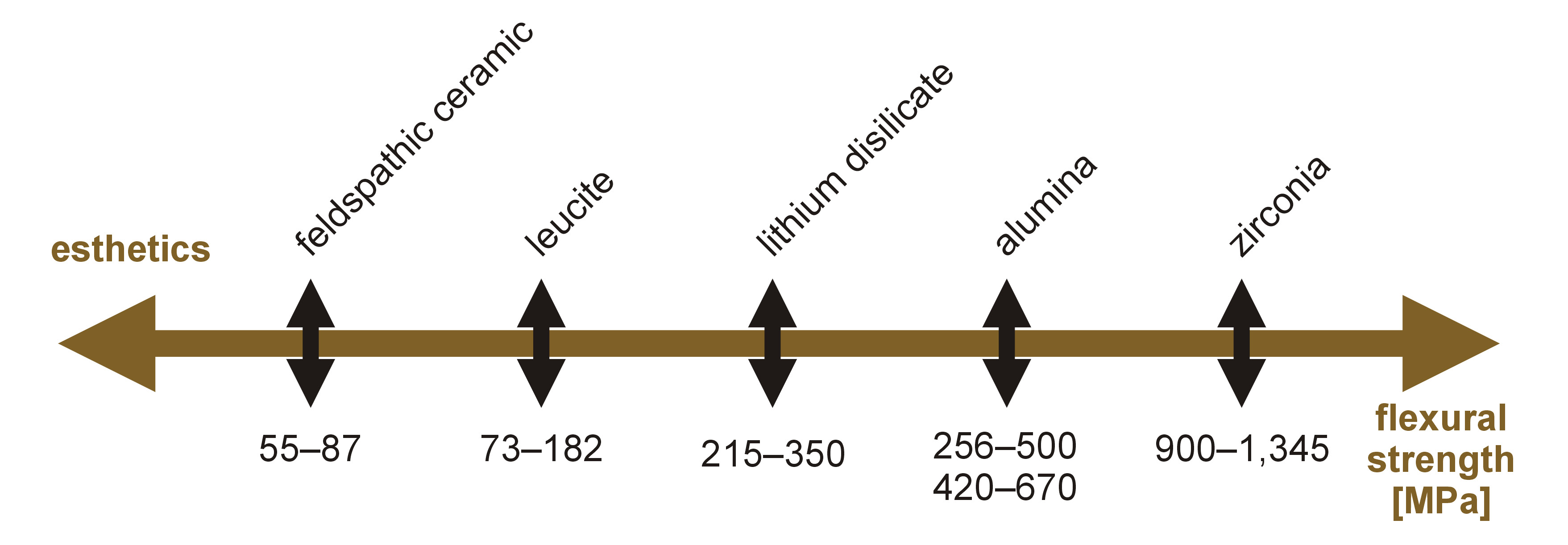 The ongoing search for the ideal restorative material in terms of resistance characteristics, esthetics and biocompatibility has led to the development of new materials in modern restorative dentistry. The innovations have been implemented in implantology as well. However, at present, we can affirm that there is no consensus on the ideal material that adapts to all cases. The most esthetic materials have lower flexural strength and vice versa (Figure 1).1