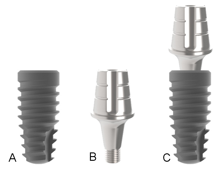 This in vitro study used 1 conical implant with a Morse-tapered connection, with dimensions of 11 mm in length and 4 mm in diameter, and 6 abutments (1 per crown) – 4.5 mm in diameter, 6 mm in height and 3.5 mm in the transmucosal length. All pieces were manufactured by Implacil De Bortoli (São Paulo, Brazil) and are demonstrated in Figure 2.
