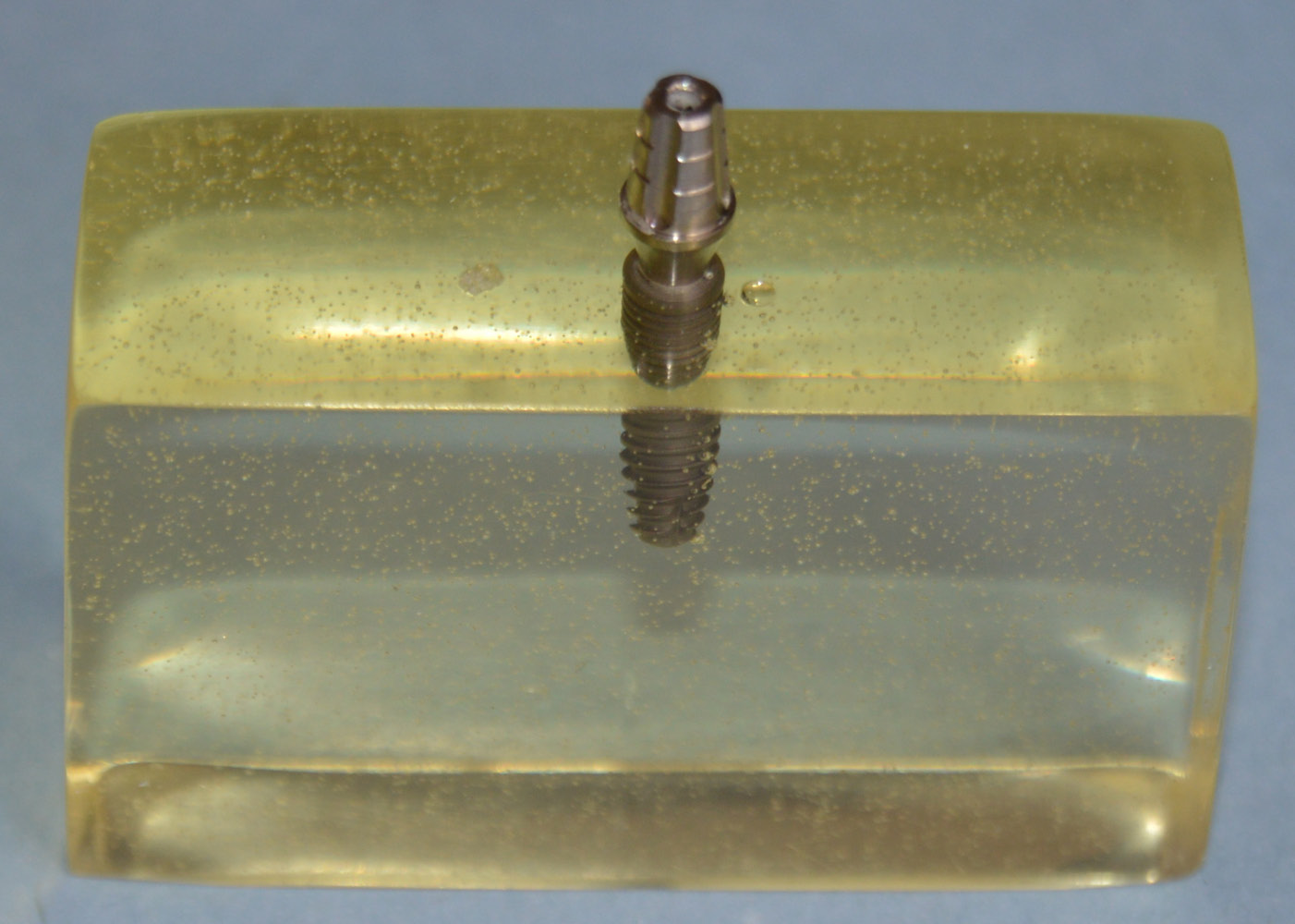 Initially, the implant was installed in a wooden block with dimensions of 12 mm in thickness, 25 mm in height and 30 mm in length at a depth of 2 mm from the surface of the block, according to the manufacturer’s recommendations. Then, the abutment was screwed to the implant and a silicone impression was made with the use of the transfer abutment indicated for the system, generating a mold for the inclusion of the implant in resin. The implant–abutment set was positioned with the abutment connected to the transfer abutment inside the silicone mold and resin was poured, filling all spaces. A flexible epoxy resin model G4 (Polipox, São Paulo, Brazil) was used. After the complete polymerization of the resin, the block was polished using a sequence of sandpaper and resin polishing pastes. Figure 3 shows the resin block with the implant–abutment set.