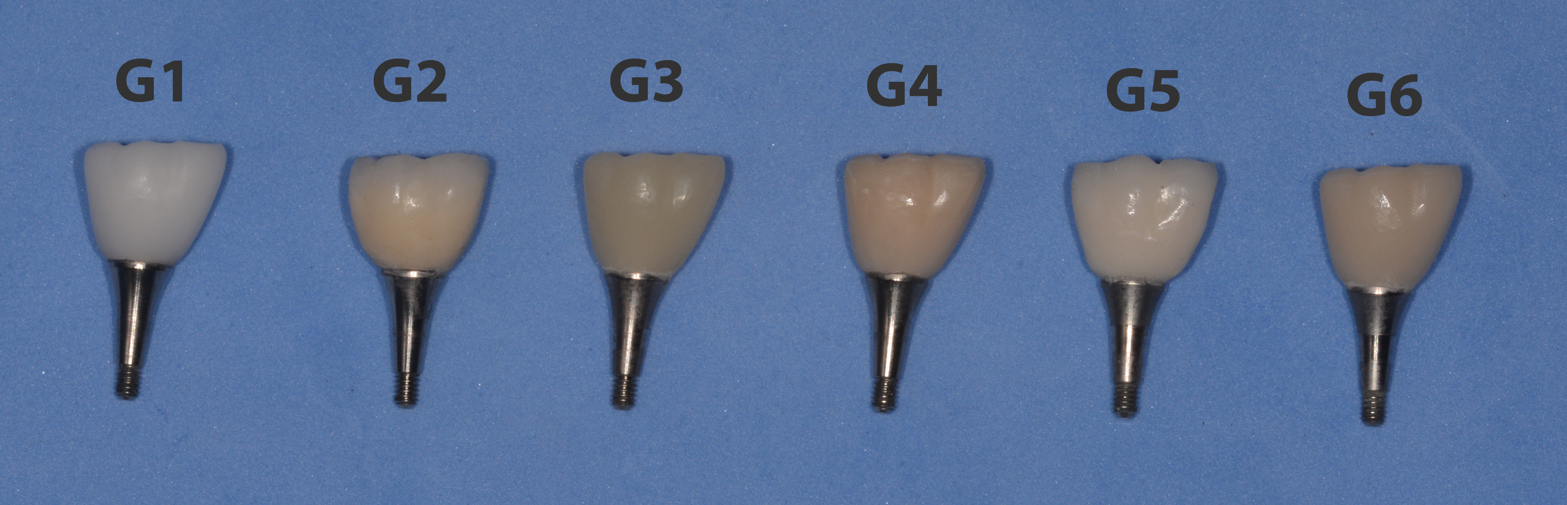 A plastic cap corresponding to the abutment dimensions was installed over 1 abutment, and a dental crown corresponding to a lower right first molar, with dimensions equal to the natural anatomical measurements described for this dental element (11.4 mm in the mesio-distal direction, 10.2 mm in the buccal-lingual direction and 7.7 mm in height),14 was waxed and polished. Then, a matrix (barrier) was made with silicone for the elaboration of the crowns in which ceramic was applied manually (the metal-ceramic and zirconia-ceramic crowns). In addition, the crown and the abutment were scanned using a dental scanner (Cerec® AC; Dentsply Sirona, Behnheim, Germany) for the subsequent milling of the crowns in 5 different materials and the preparation of the metal-ceramic crown, which was fabricated using the conventional method. Six groups were formed according to the material used: feldspathic ceramic (G1); metal-ceramic (VITA VM9; VITA Zahnfabrik, Bad Säckingen, Germany) (G2); hybrid ceramic (Shenzhen Upcera Dental Technology Co. Ltd., Shenzhen, China) (G3); yttria-stabilized tetragonal zirconia polycrystal (Y-TZP) covered with ceramic (VITA VM9; VITA Zahnfabrik) (G4); partially stabilized Y-TZP (inCoris TZI; Dentsply Sirona) (G5); and lithium disilicate (Shenzhen Upcera Dental Technology Co. Ltd.) (G6). Figure 4 shows the crowns fabricated for each group, positioned on the abutments.