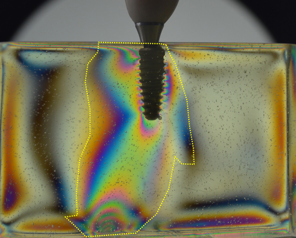 The photoelasticity test is commonly used in engineering. This type of analysis, which generates fringes with different colors, has been widely used also in dentistry for determining the pattern of stress dissipation in structures that receive loads. However, there is significant variation in the methodologies applied to evaluate the results. In some studies, the fringes were evaluated, in others – the dissipation area, and yet others proposed the development of computer programs for the determination and analysis of the stress dissipation values.19, 33, 43, 44 In the present study, we proposed a new methodology for data evaluation, in which it was possible to find a pattern of stress distribution after load application to determine differences in behavior between the various materials tested. The variation found in the pattern of load distribution around the implant indicated the yellow color as the main element of analysis. However, new studies must be carried out to prove and corroborate these findings.