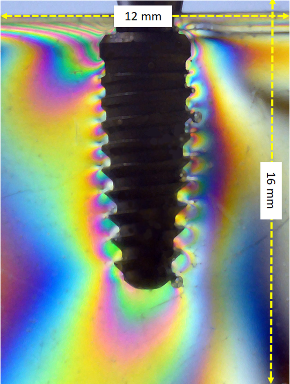 Then, to quantify the fringes in the total images, all images were standardized to 12 mm in width and 16 mm in height, as shown schematically in Figure 6. For the crestal area, the images were standardized to assess cervical loads as follows – from the implant platform to the 3rd thread (4 mm) and at a distance of 4 mm from the implant platform – as shown schematically in Figure 7. A program was developed for the evaluation and quantification of the main colors of the fringes in each image.