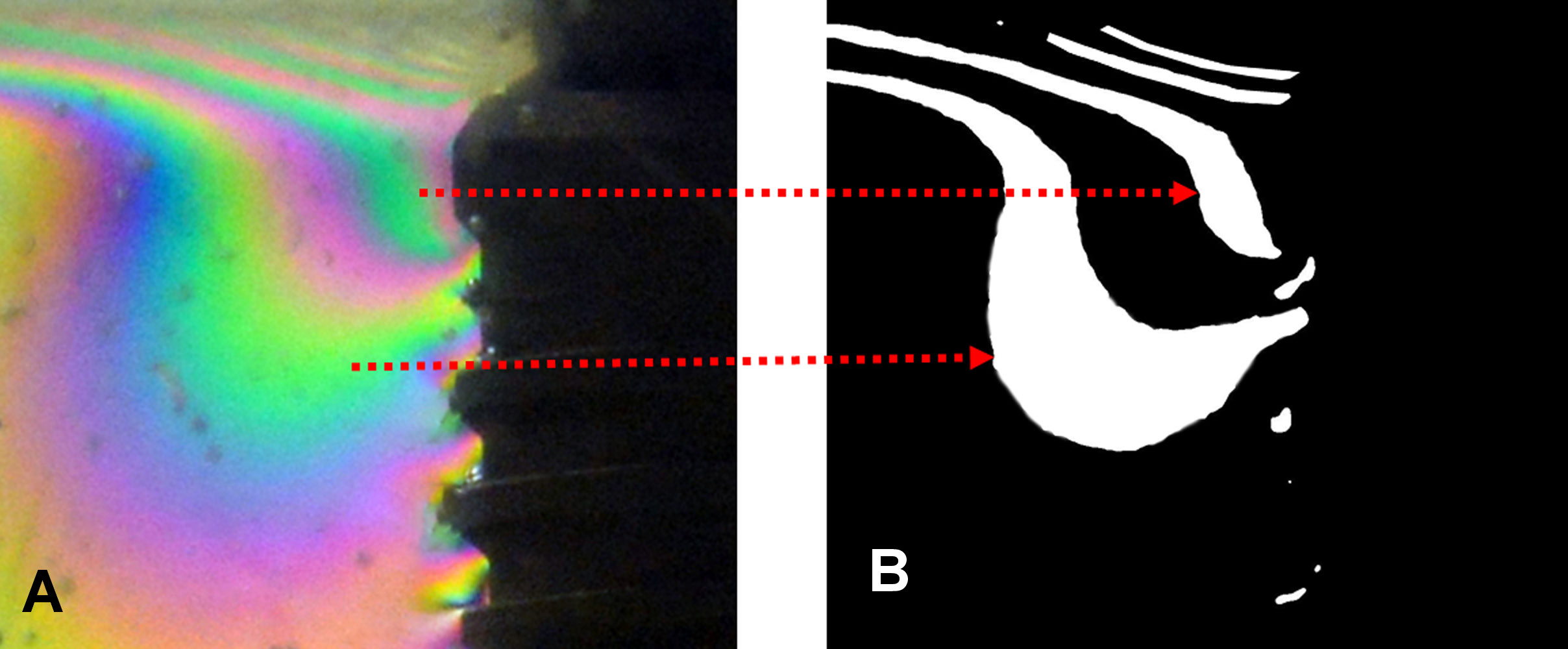In order to analyze the distribution of fringes in the images, a Python application was created using the scikit-image processing library.15 The application takes an image, a color and 2 parameters as the input. The color parameters are given as the a* and b* values of a color in the International Commission on Illumination (Commission internationale de l’éclairage – CIE) L*a*b* color space16; the 2 remaining parameters are the lightness parameter λ and the error parameter ε. The input image can be given in the RGB (red, green and blue) color space, but it is then converted to the CIE L*a*b* color space, using the standard illuminant, so that the color variables of each pixel can be analyzed independently of the varying luminosity.