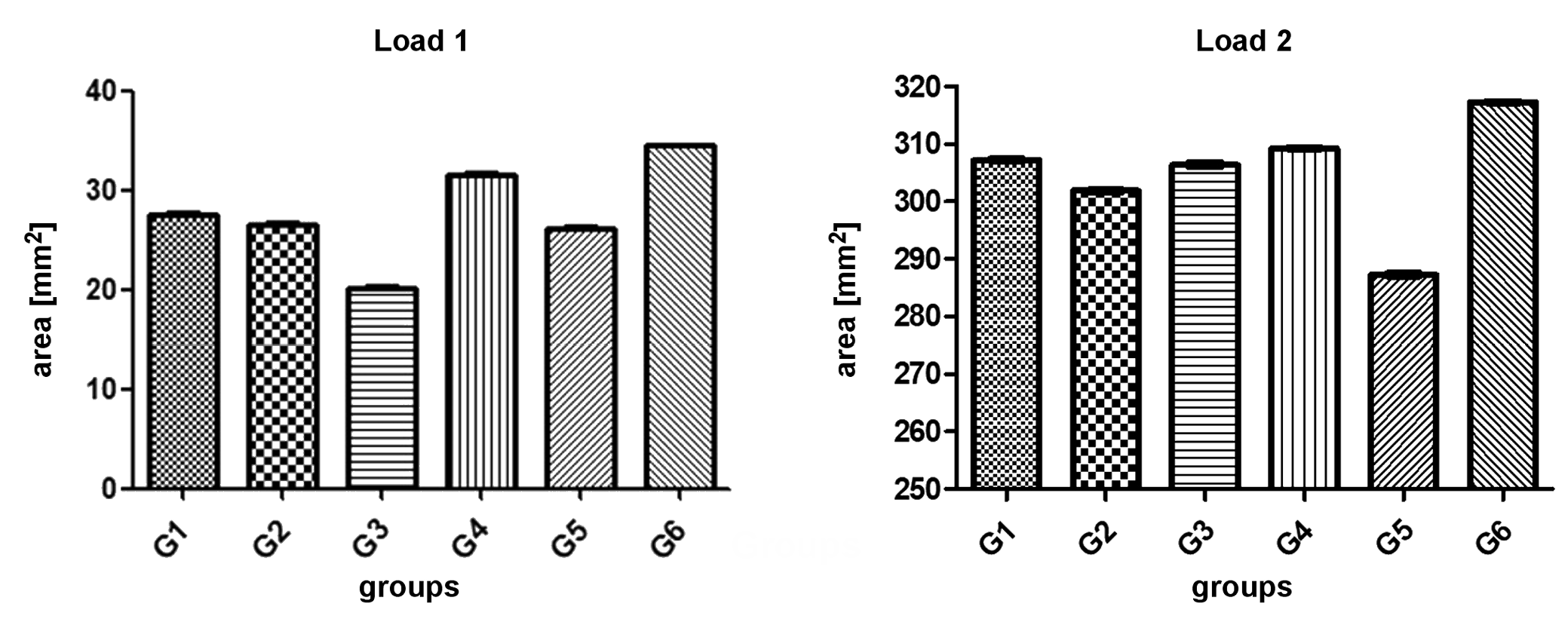 Load distribution in the resin base, which simulates the bone tissue, varied in the 6 groups, showing statistically significant differences between the values with regard to the tested load conditions (p < 0.0001). Under load 1, G3 showed the lowest stress dissipation around the implant, while under load 2, G5 showed the lowest stress dissipation around the implant. The values of the area of stress dissipation for each group are shown in Table 1. Figure 9 graphically shows the data for all groups with regard to the 2 loads.