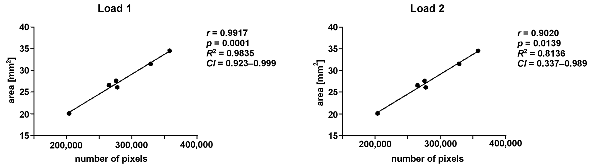 Applying Pearson’s correlation test, a positive correlation was detected between the data for the total area and the total number of pixels (Figure 10).
