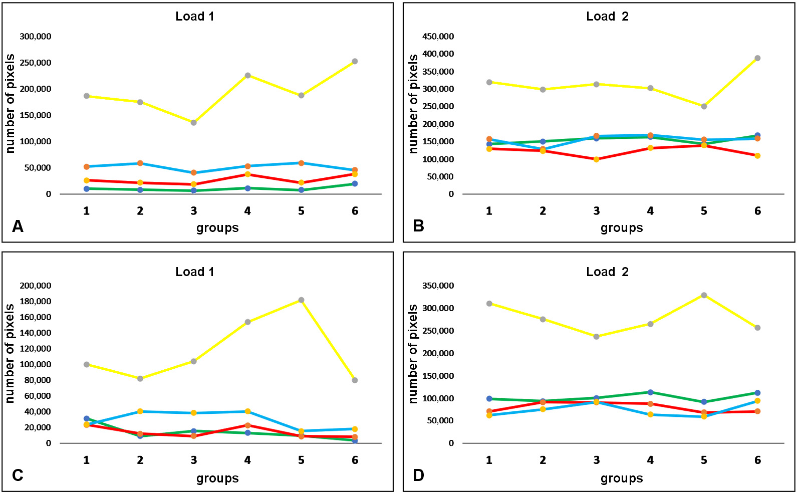 In assessing the number of pixels corresponding to each evaluated color tone, the yellow tone was the one that varied the most between the 2 load intensities in all groups and in both image sizes. Figure 11 shows the distribution of the total number of pixels measured for each color in both image sizes.