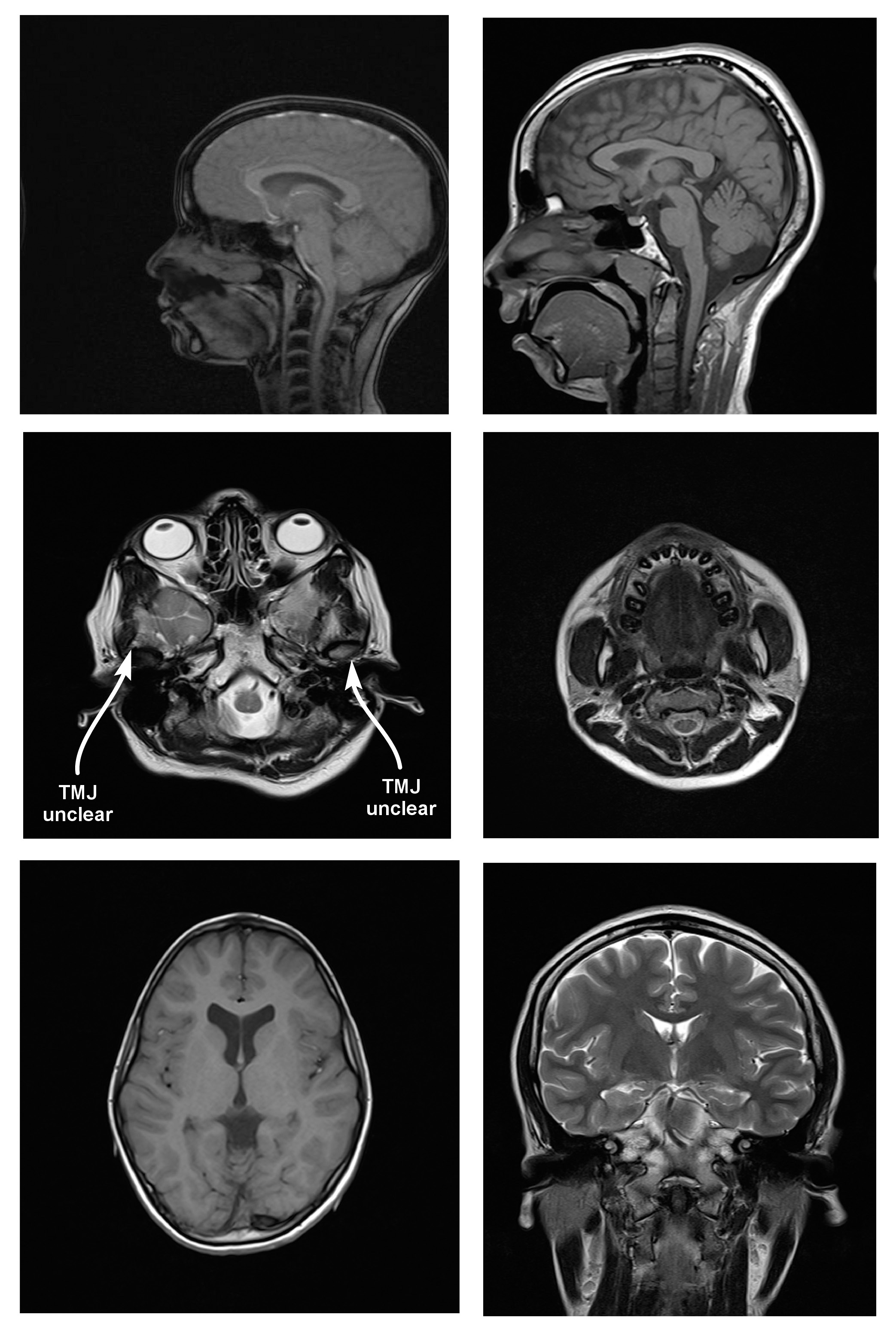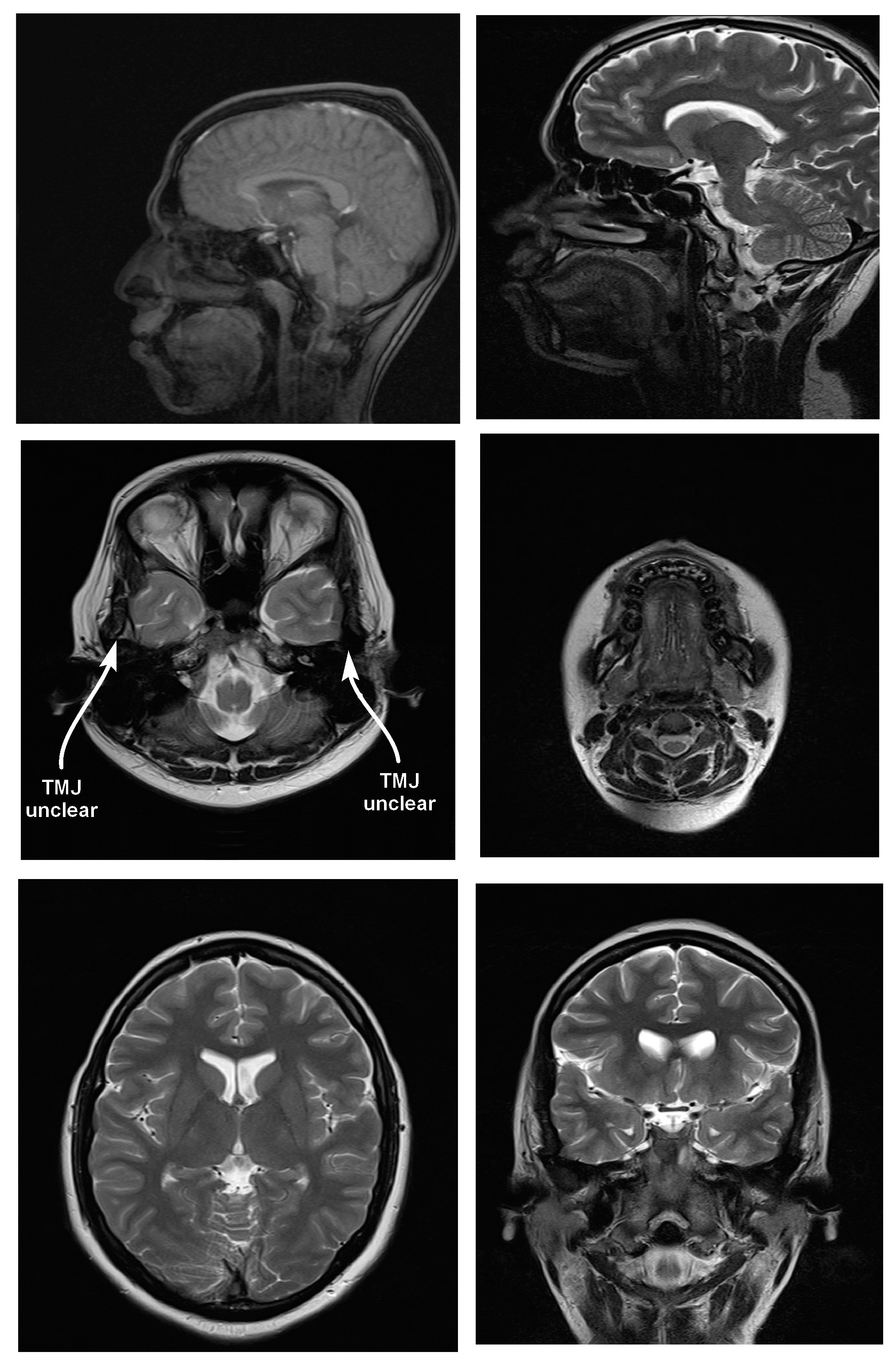 For TMJ, sagittal, axial and coronal proton density (PD)-weighted and turbo spin-echo (TSE) transverse relaxation time (T2)-weighted sequences were employed with TR 5,653 ms, TE 13 ms and 102 ms, a slice thickness of 2 mm, an inter-slice gap of 0.2 mm, an FoV of 160 mm × 160 mm, and a matrix of 256 × 256. For the remaining regions, the MRI neck protocol was used. Axial and coronal TSE T2-weighted images were acquired with TR 5,600 ms, TE 114/7 ms, a slice thickness of 5 mm, an inter-slice gap of 0.5 mm, an FoV of 240 mm × 240 mm, and a matrix of 320 × 320.