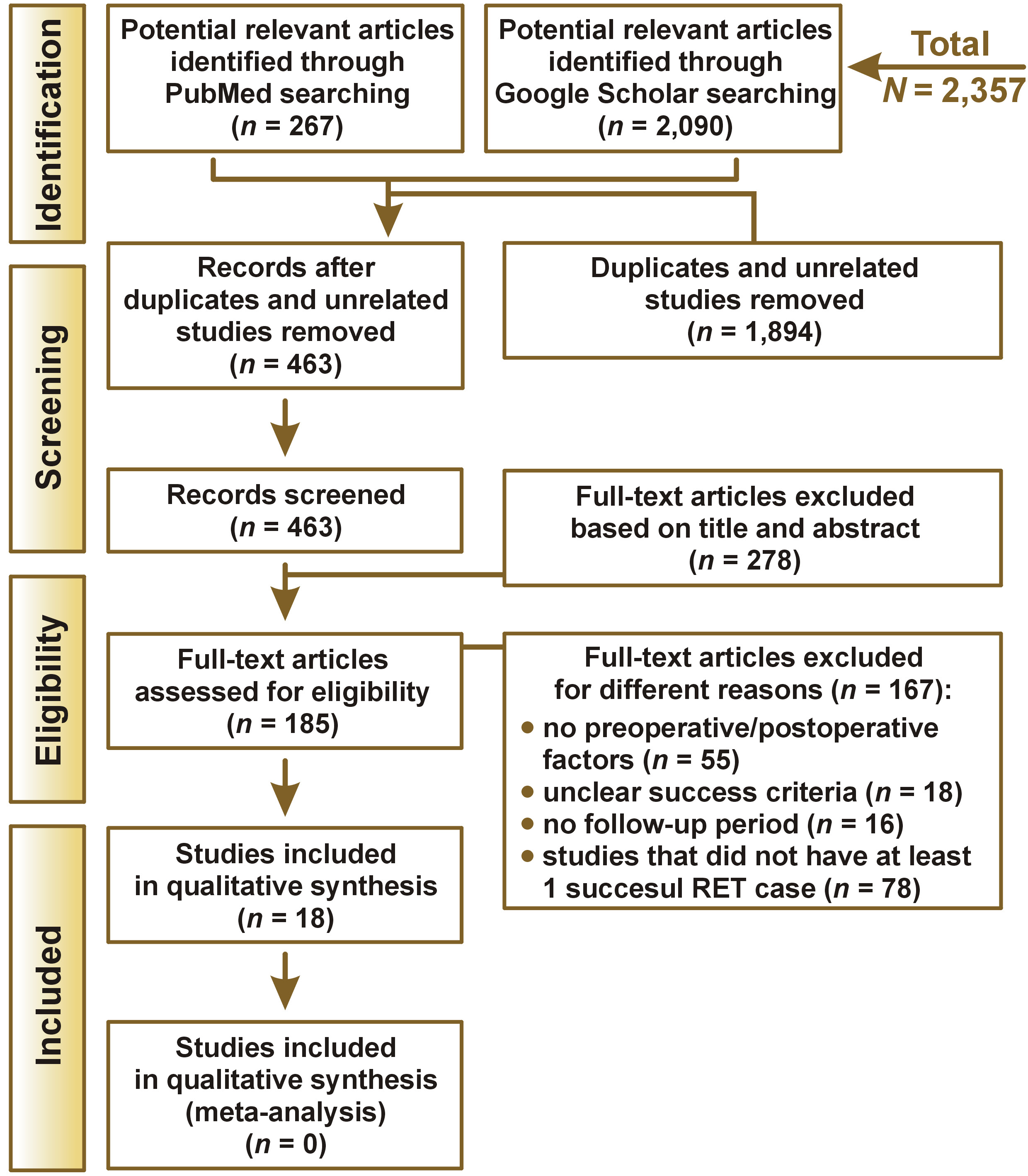 The search ultimately included 18 human studies that satisfied both the inclusion and exclusion criteria and had been conducted within the last 6 years. These studies compared the different factors influencing RET outcomes for successful cases. The 18 included studies had a total sample of 250 successful cases of RET.13, 28, 29, 30, 31, 32, 33, 34, 35, 36, 37, 38, 39, 40, 41, 42, 43, 44 The types of studies included in this systematic review were as follows: 7 case reports/case series28, 30, 35, 36, 37, 41, 44; 3 prospective studies33, 39, 43; 5 retrospective studies31, 32, 34, 38, 40; and 3 randomized clinical trials (RCTs).13, 29, 42 The number of successful RET cases ranged from 1 to 45, with the total number of 250. The distribution of these 250 cases was as follows: 10 were extracted from case reports/case series; 74 were identified from prospective studies; 112 were identified from retrospective studies; and 54 cases were identified from RCTs (Table 2). The informative description of all included studies and the different factors influencing RET outcomes for successful cases are summarized in Table Table Table 2 and Table 3.